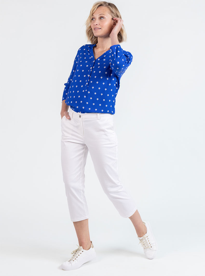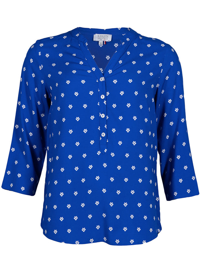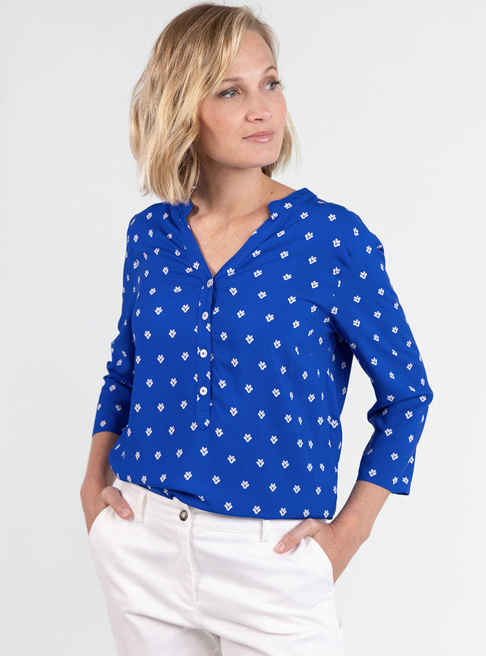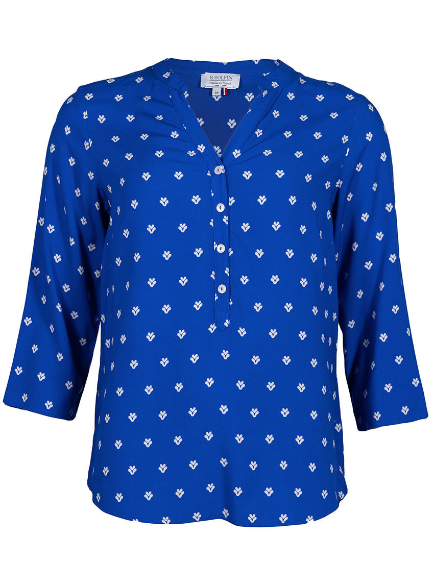 Le Bleu Mer, profond et apaisant, évoque l’évasion et la fraîcheur. Il se marie facilement avec des tons clairs comme le blanc, l’écru ou le beige, mais aussi avec un jean ou un pantalon fluide pour un look chic et décontracté. Une blouse polyvalente, idéale aussi bien pour le bureau que pour les moments plus casual.