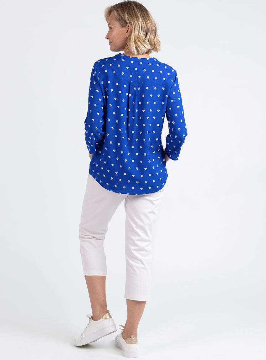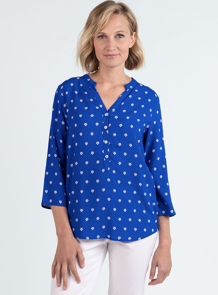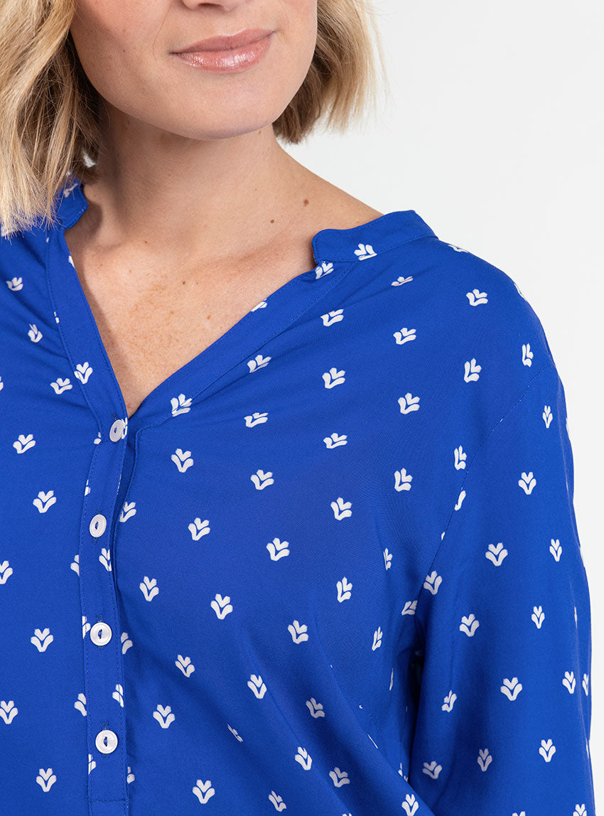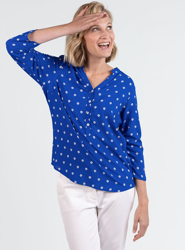 Le Bleu Mer, profond et apaisant, évoque l’évasion et la fraîcheur. Il se marie facilement avec des tons clairs comme le blanc, l’écru ou le beige, mais aussi avec un jean ou un pantalon fluide pour un look chic et décontracté. Une blouse polyvalente, idéale aussi bien pour le bureau que pour les moments plus casual.