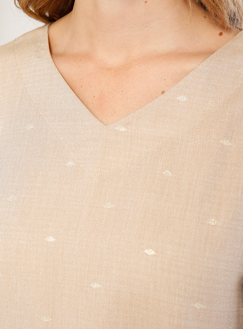 Confectionnée dans un mélange de coton, viscose et fil métallisé, elle allie douceur, confort et raffinement. Son décolleté en V discret et sa légère brillance apportent une touche chic sans en faire trop — parfaite aussi bien pour une journée au bureau que pour une sortie en ville.