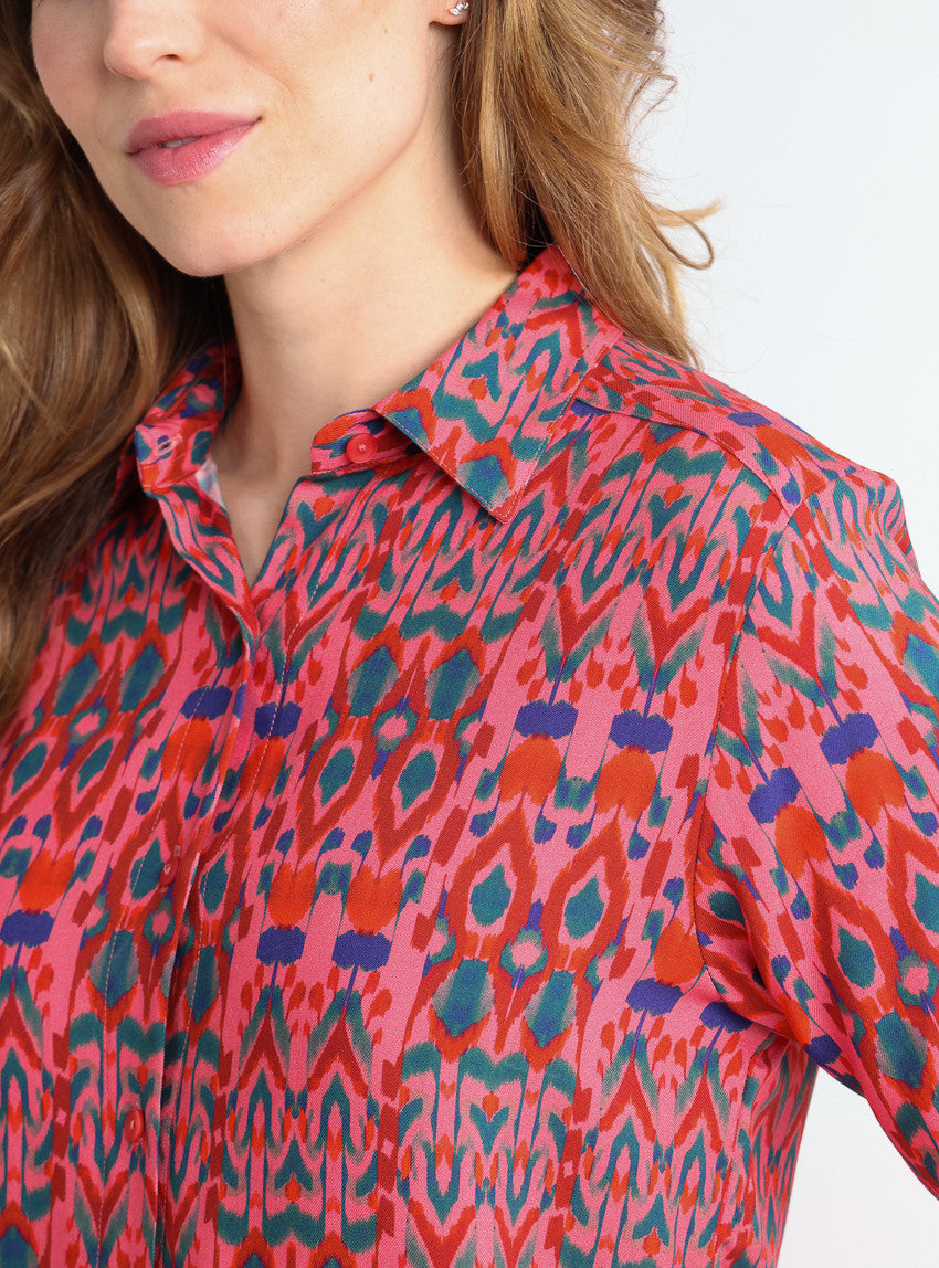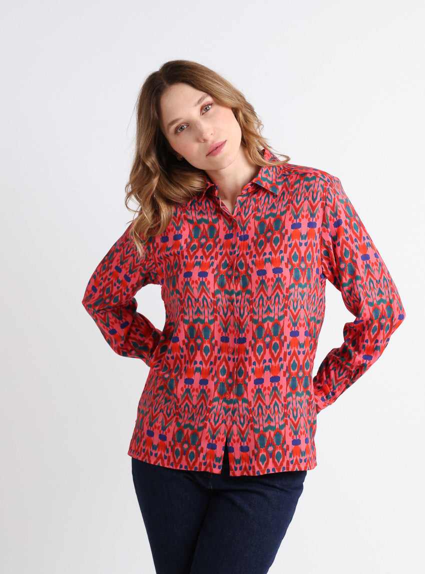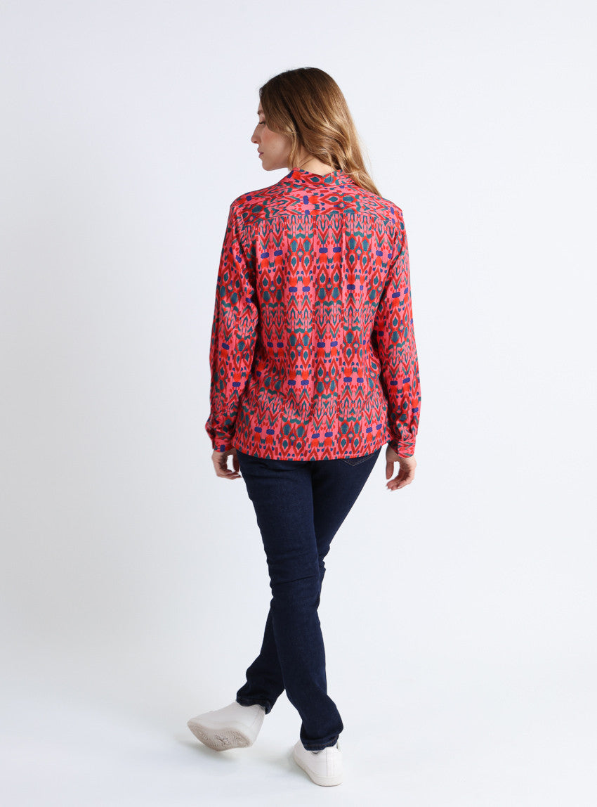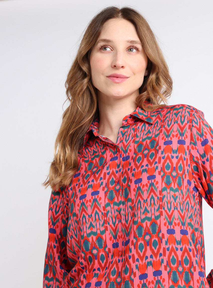 Ce chemisier femme à motifs floraux rouge et rose est une pièce raffinée qui allie confort et style. Confectionné en 100% viscose chaude, il se dis...