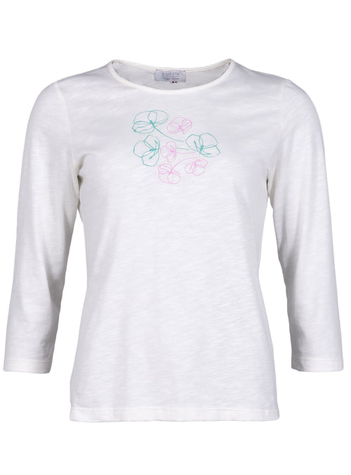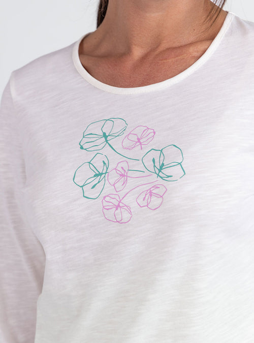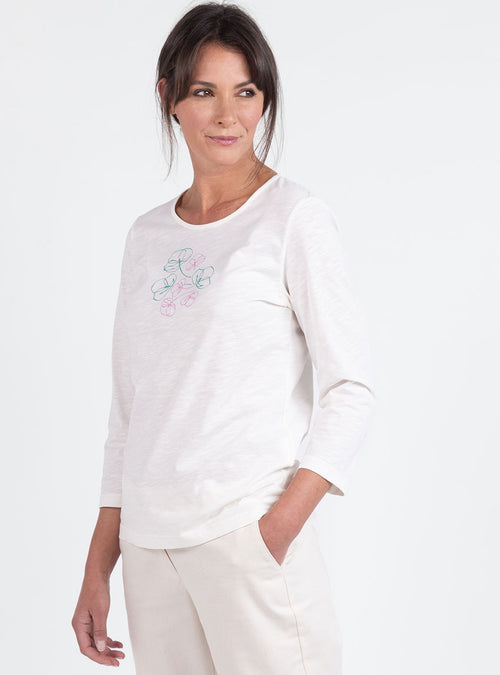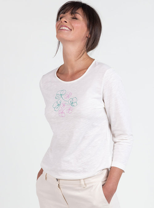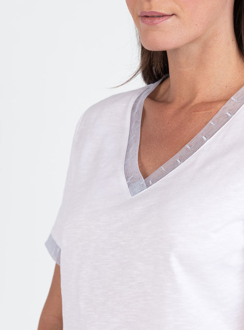 Tee-shirt femme col V brodé en coton peigné blanc