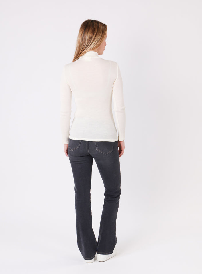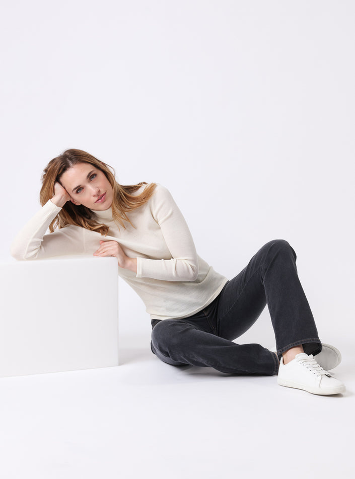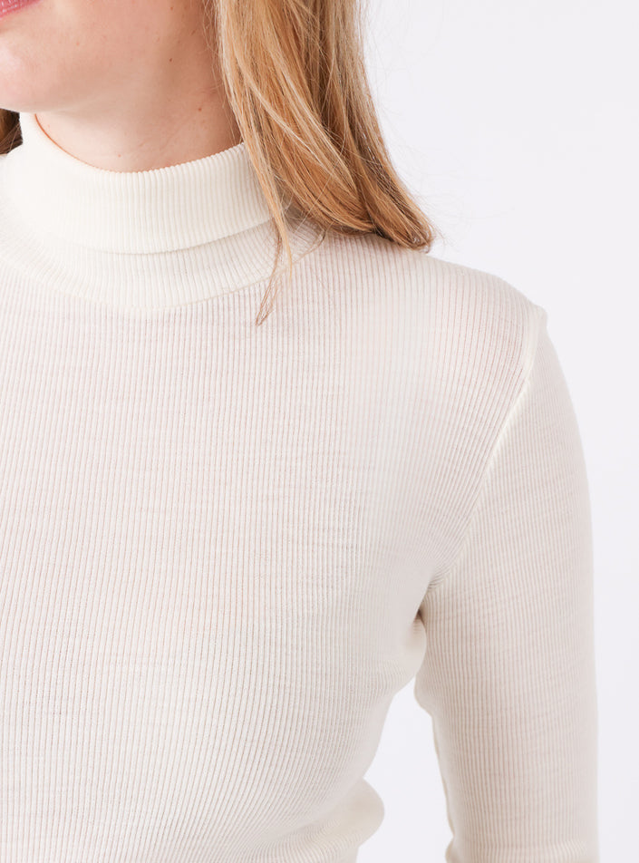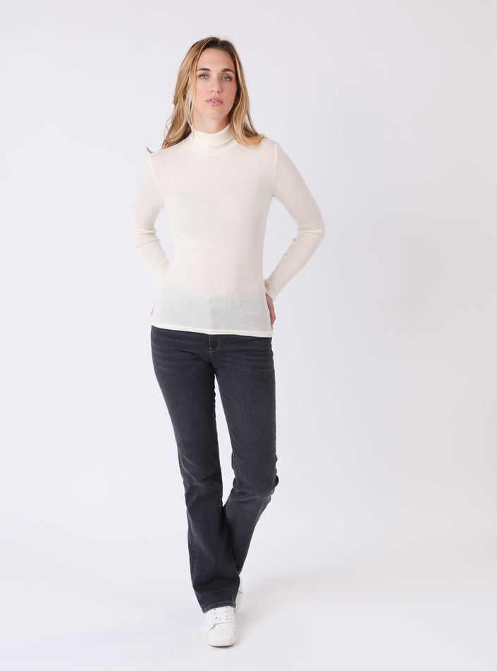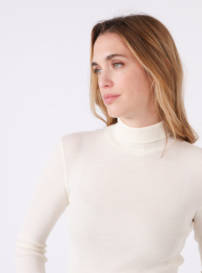 Adoptez l’élégance minimaliste avec ce pull chaussette femme col roulé en blanc naturel. Sa coupe ajustée, légère et confortable en fait un basique...