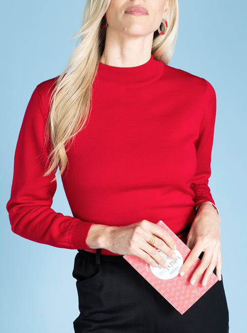 Pull femme col cheminée en laine mérinos Rouge Intense