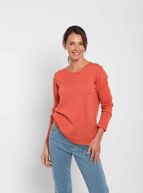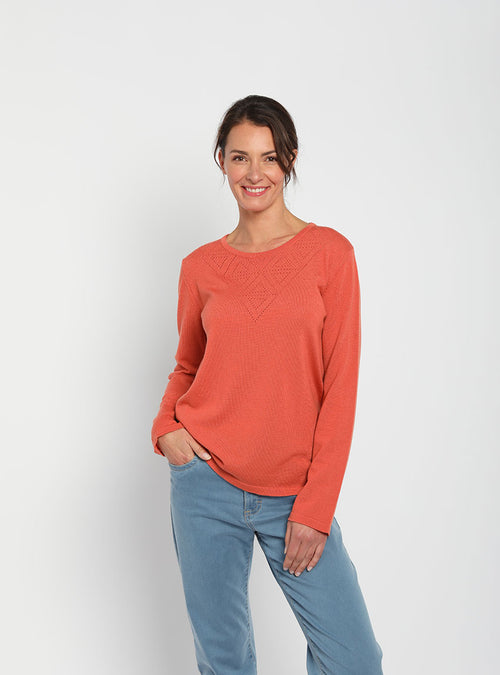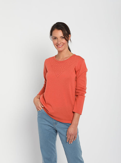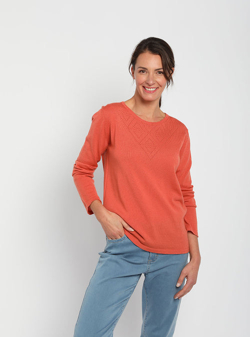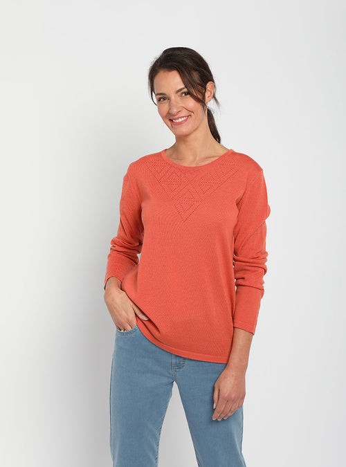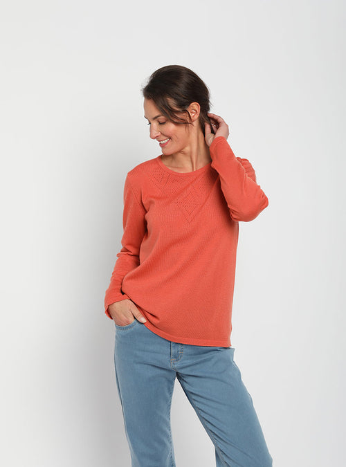 Pull femme col ajouré orange tendre