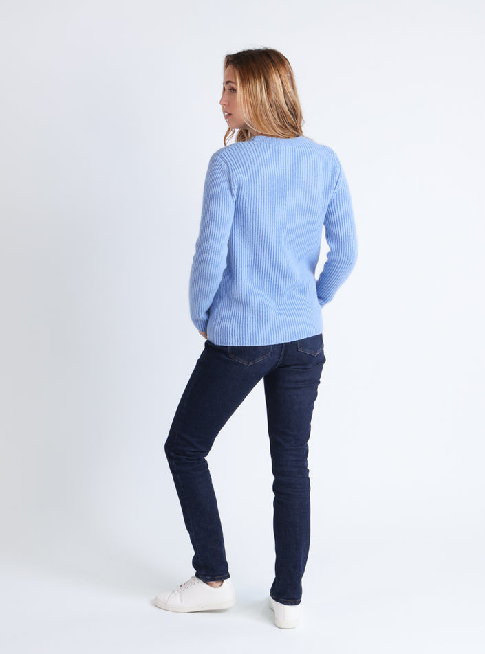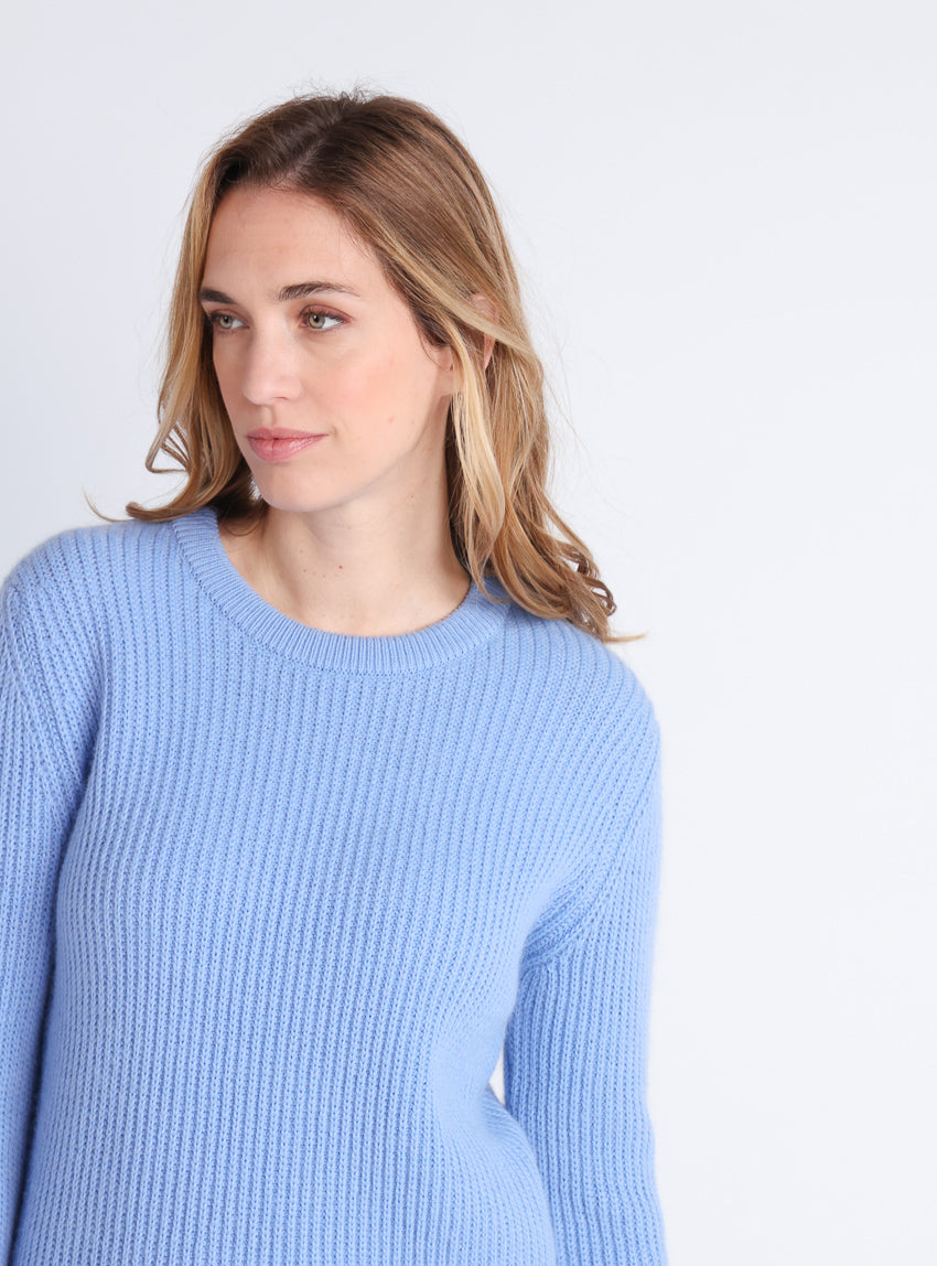 Chaleur, douceur et élégance se réunissent dans ce pull femme en coloris bleu doux. Confectionné en France, il associe confort et modernité grâce à sa coupe droite et son encolure ronde, idéale pour toutes les occasions, du quotidien aux moments plus habillés.