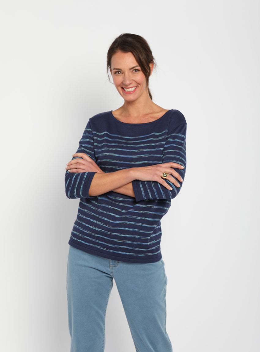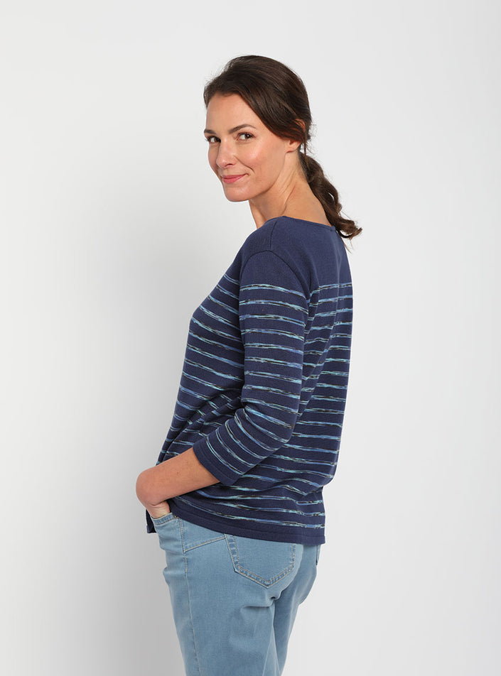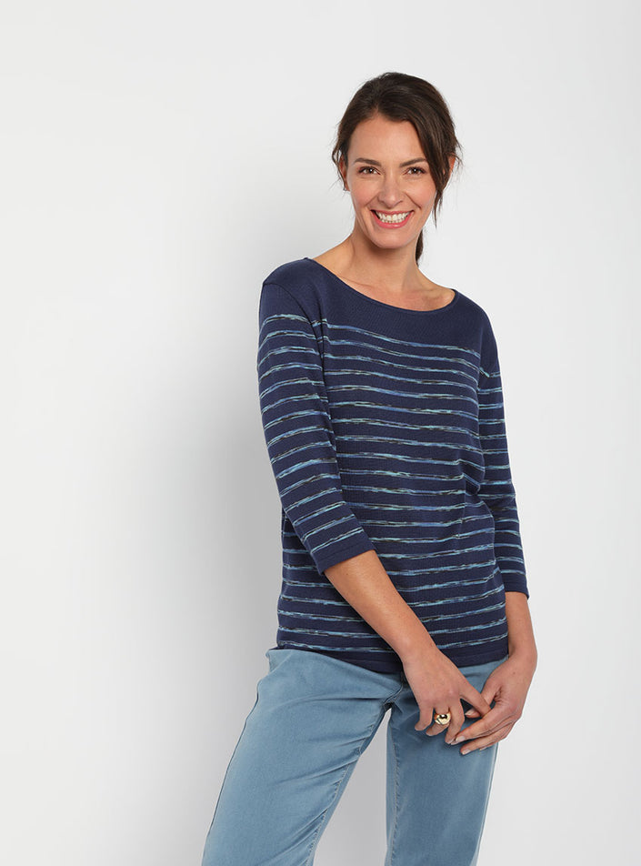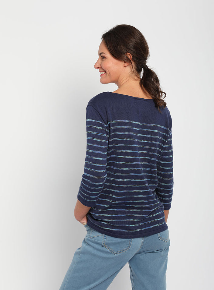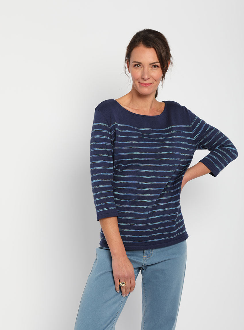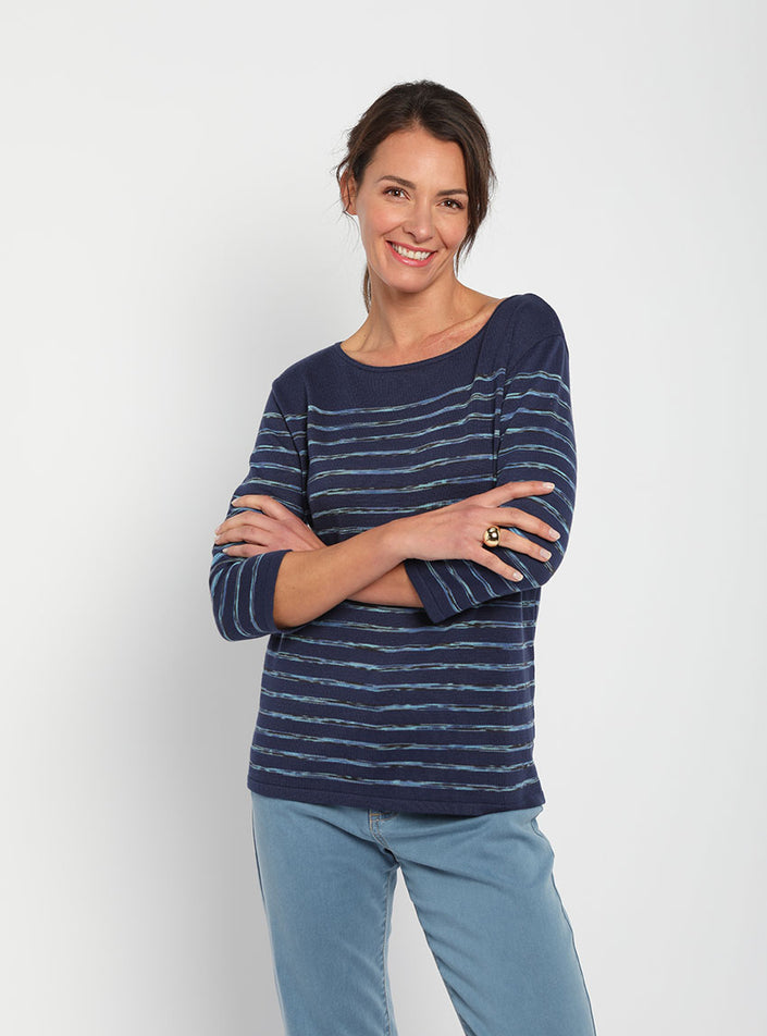 Cette marinière bleu marine réinvente un indispensable du vestiaire féminin. Avec son encolure ronde et ses manches 3/4, elle offre une coupe confo...