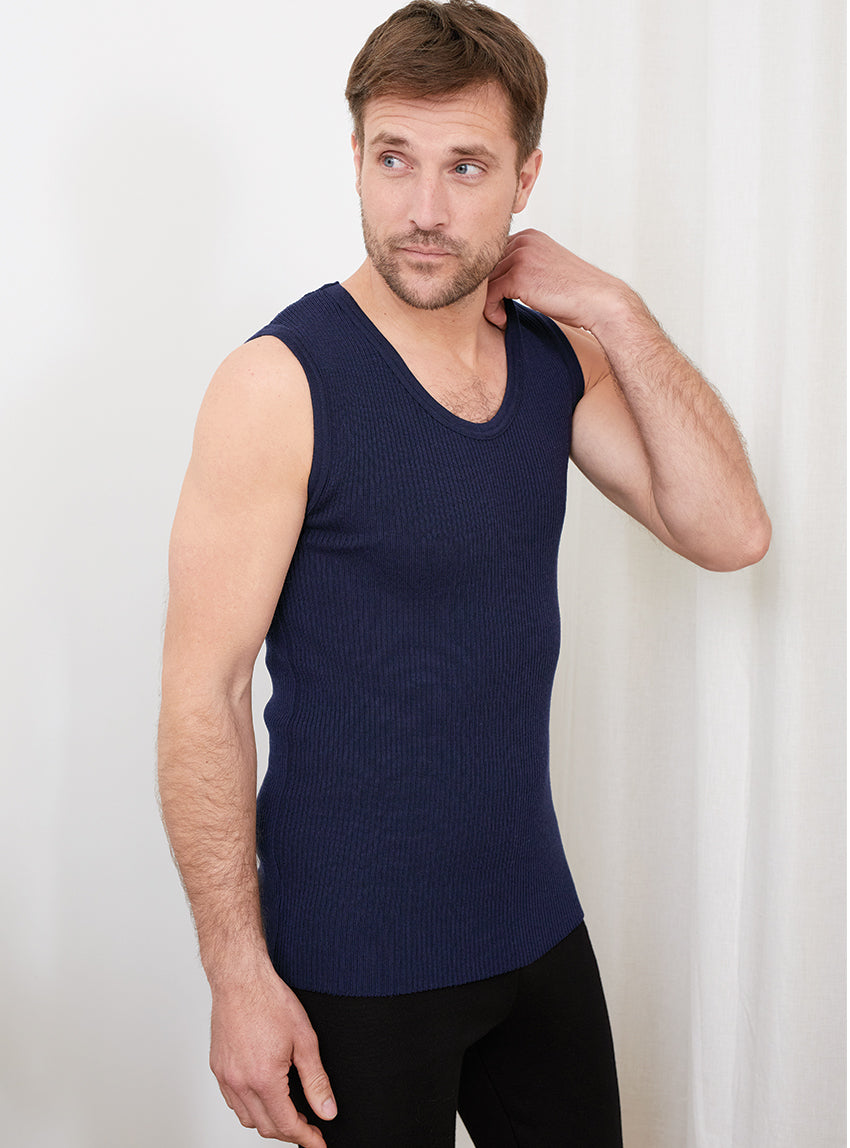 Ce maillot de corps sans manches en laine mérinos bleu marine a été conçu pour offrir une protection thermique efficace tout en conservant une gran...