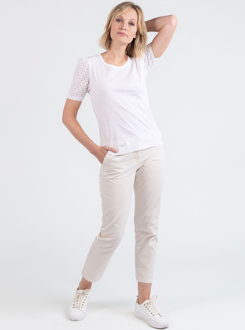 Le blanc, intemporel et lumineux, se marie facilement avec toutes les couleurs. Portez ce tee-shirt avec un jean, un pantalon fluide ou une jupe pour un look casual chic. Les détails en broderie anglaise font de ce modèle une pièce facile à habiller, parfaite aussi bien pour le quotidien que pour des occasions plus soignées.