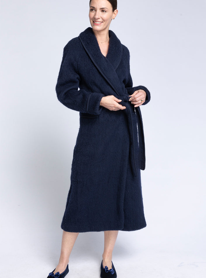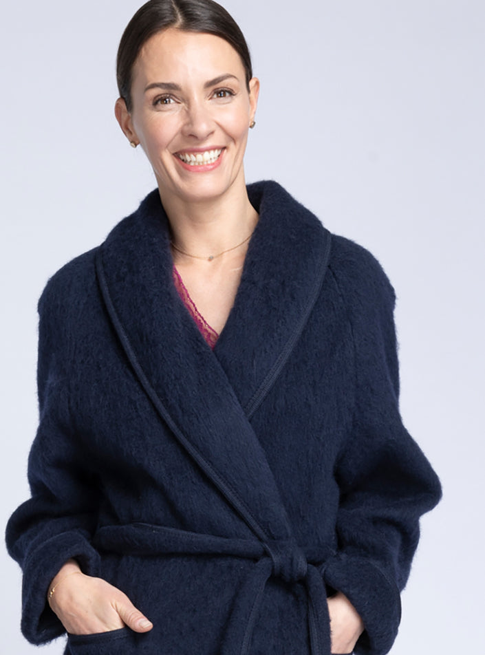 Cette robe de chambre femme en laine des Pyrénées bleu marine est l’alliance parfaite entre chaleur naturelle et élégance intemporelle. Fabriquée e...