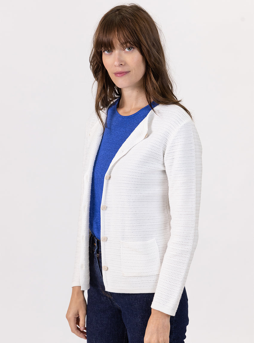 Ce cardigan femme en coton col rond coloris blanc crème est une pièce incontournable pour vos soirées d’été. Léger et agréable à porter, il combine...