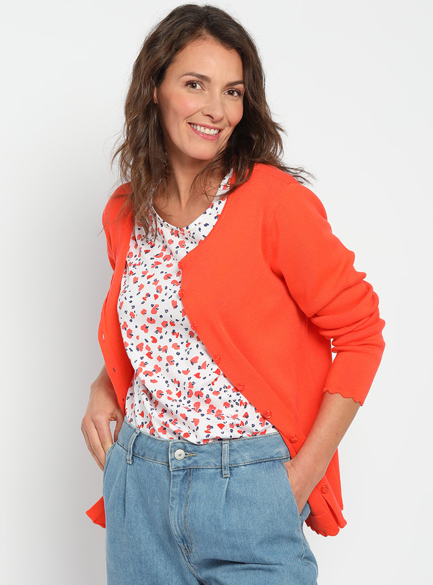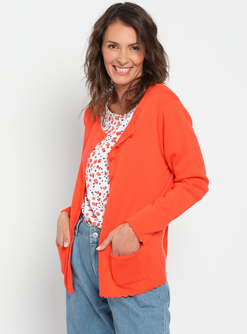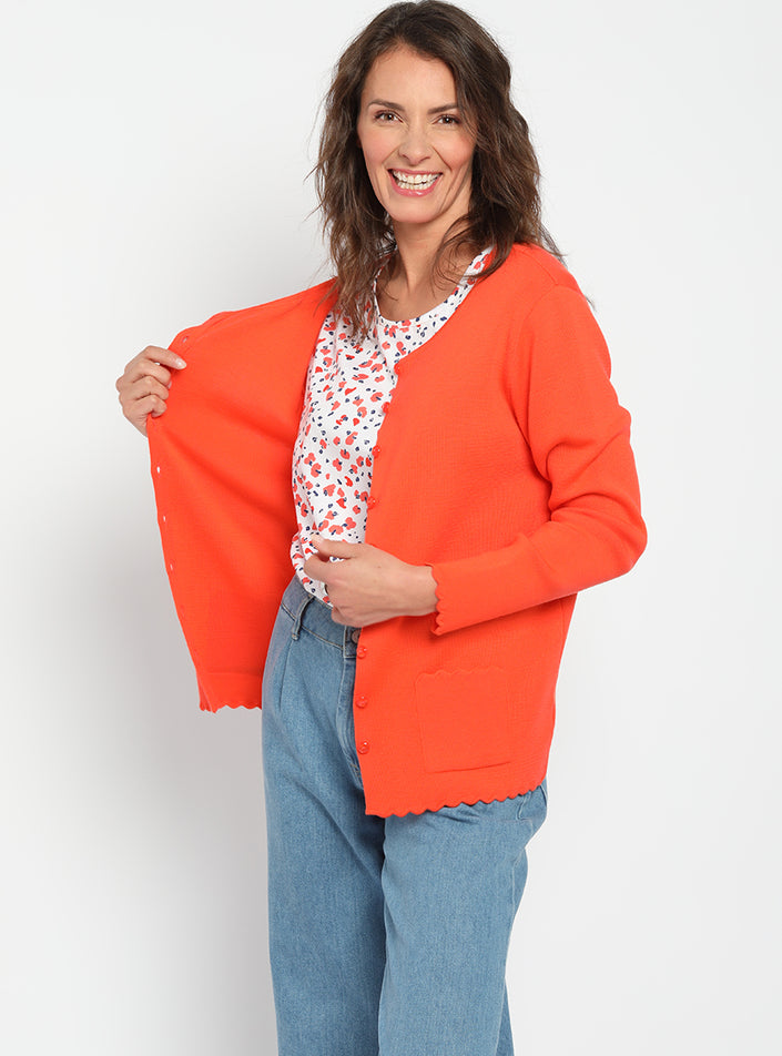 Ce cardigan en 100 % laine mérinos orange pulpe est une pièce pleine de vitalité qui allie chaleur et élégance. Sa coupe droite, son col rond et se...