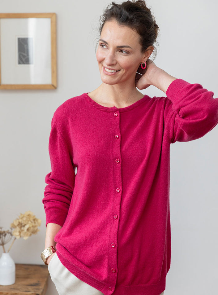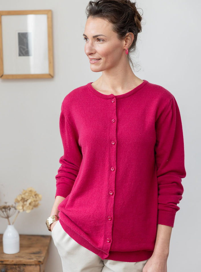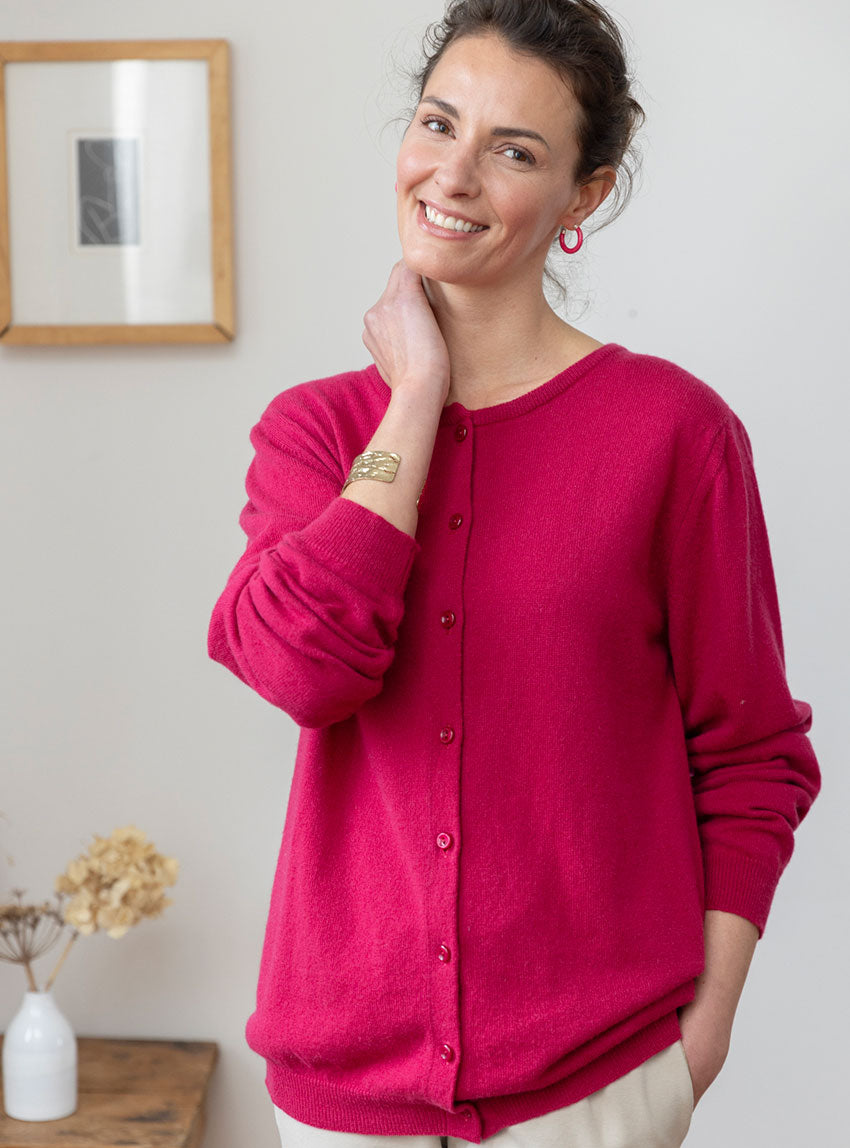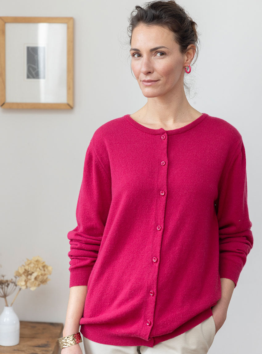 Ce cardigan 100% cachemire rose framboise est une pièce lumineuse qui allie chaleur et raffinement. Sa coupe droite, féminine et intemporelle, met ...