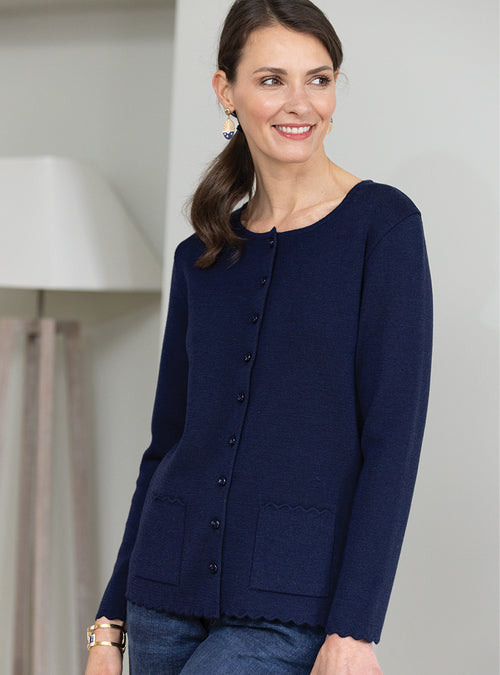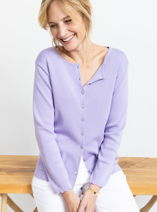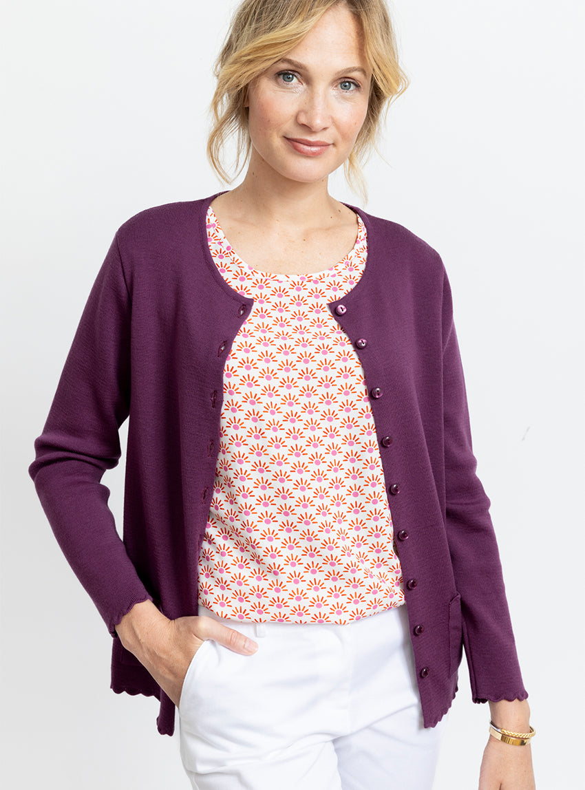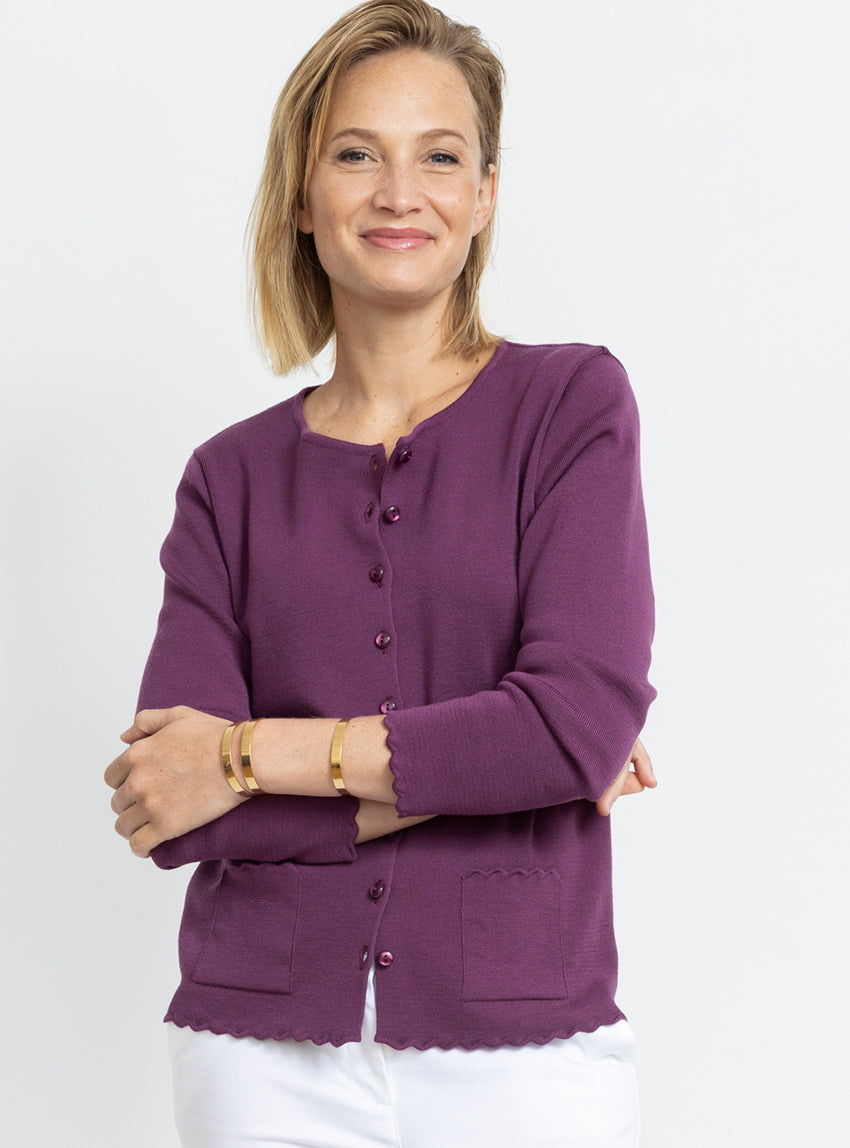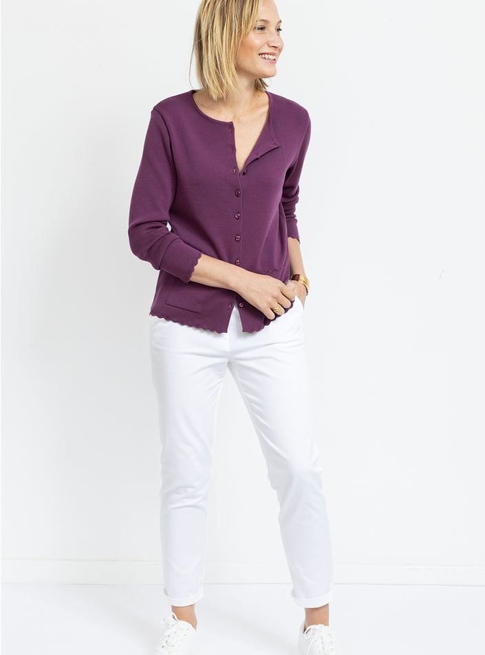Ce cardigan en 100 % laine mérinos violet prune est un basique élégant qui apporte une note originale à vos tenues. Sa coupe droite, son encolure r...