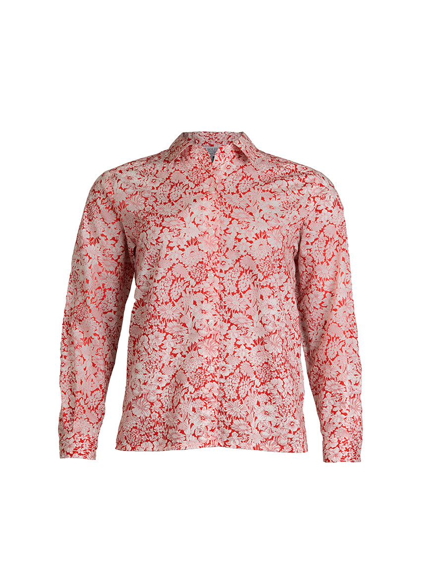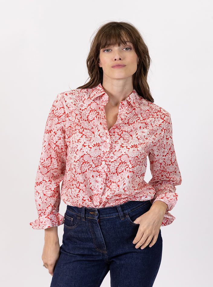 Ce chemisier imprimé Liberty rouge cerise est un véritable hymne à la féminité et à la légèreté. Confectionné en 100 % coton, il séduit par sa mati...