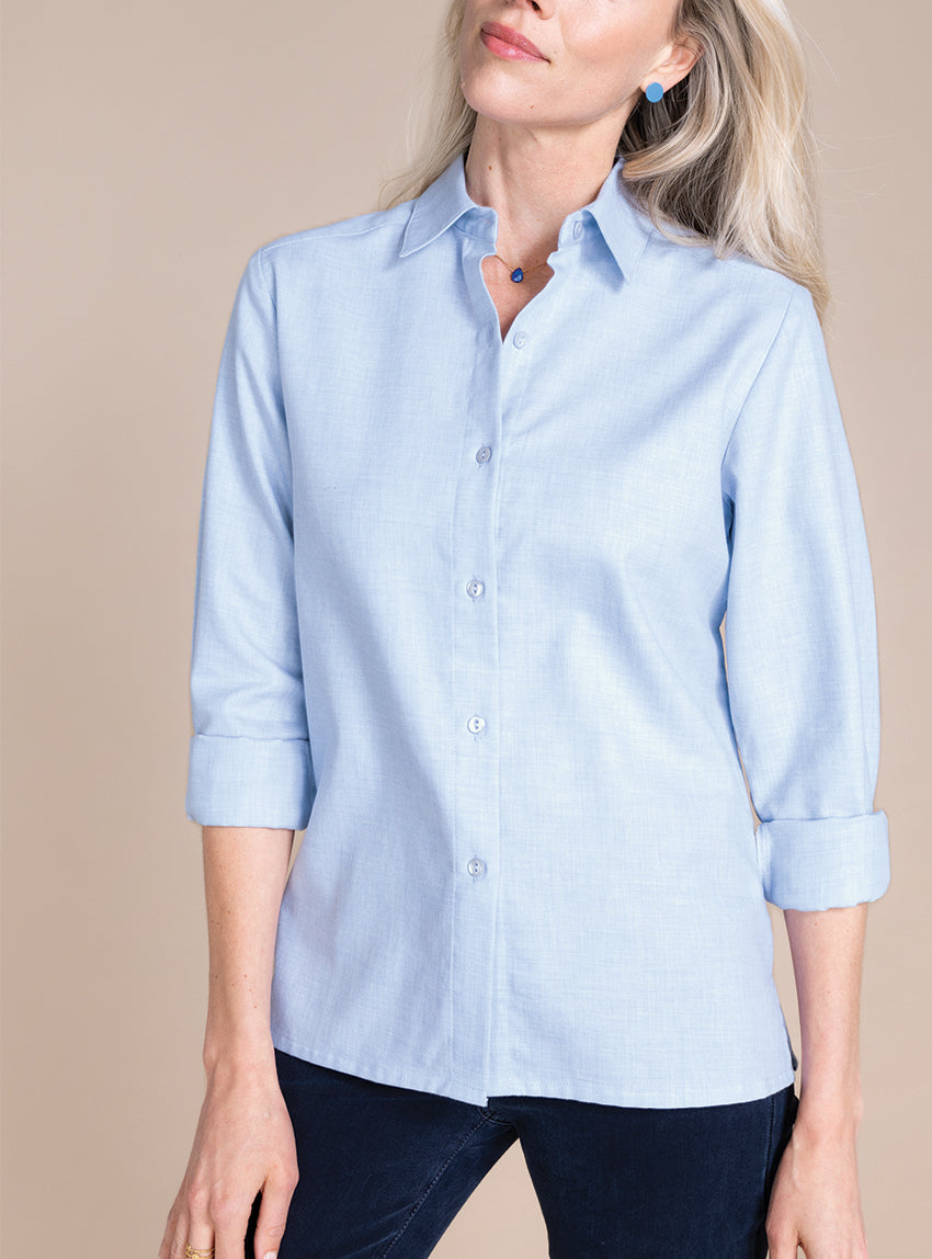 Ce chemisier uni femme en Bleu Clair, fabriqué en France, est une pièce élégante et facile à porter au quotidien. Son col sur pied structure jolime...