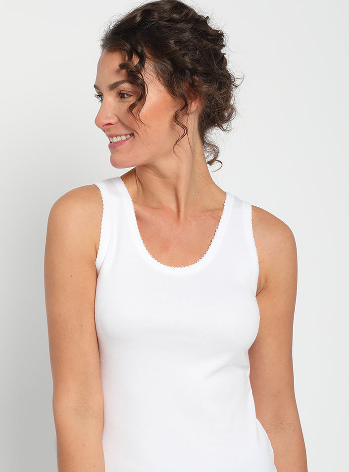 Ce débardeur femme en coton blanc a été pensé comme une pièce polyvalente qui se glisse aussi bien sous une chemise ouverte pour un look décontract...