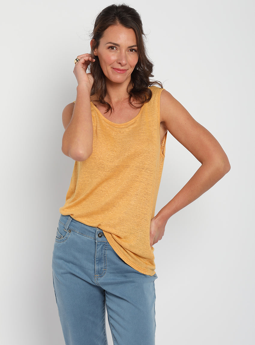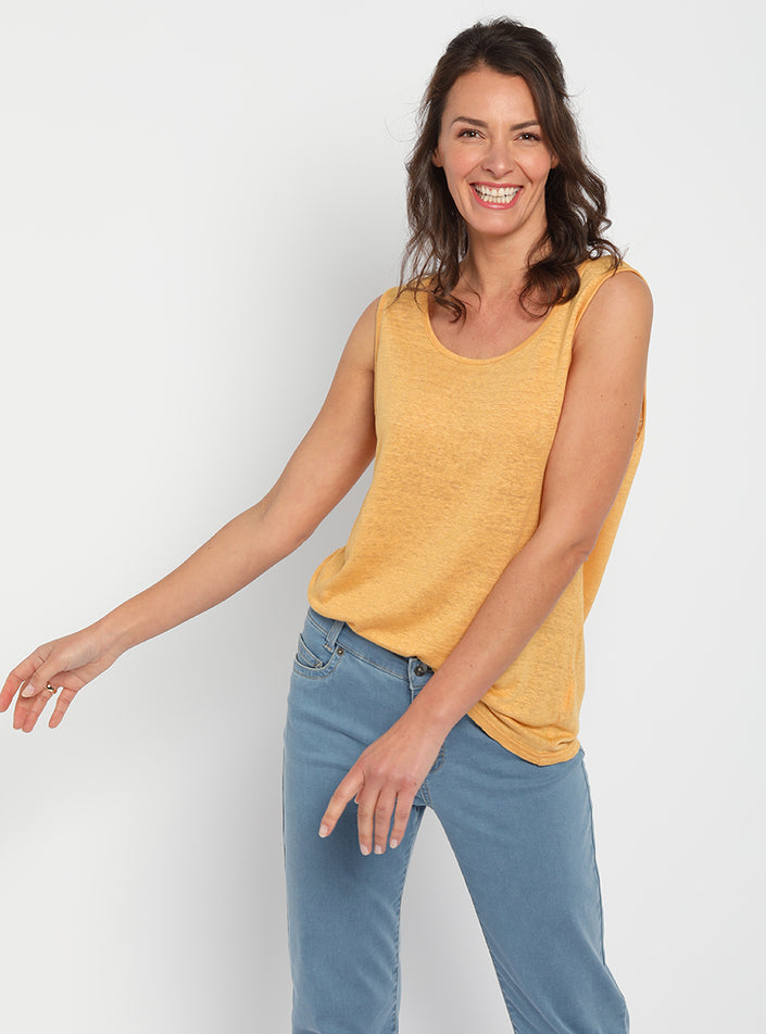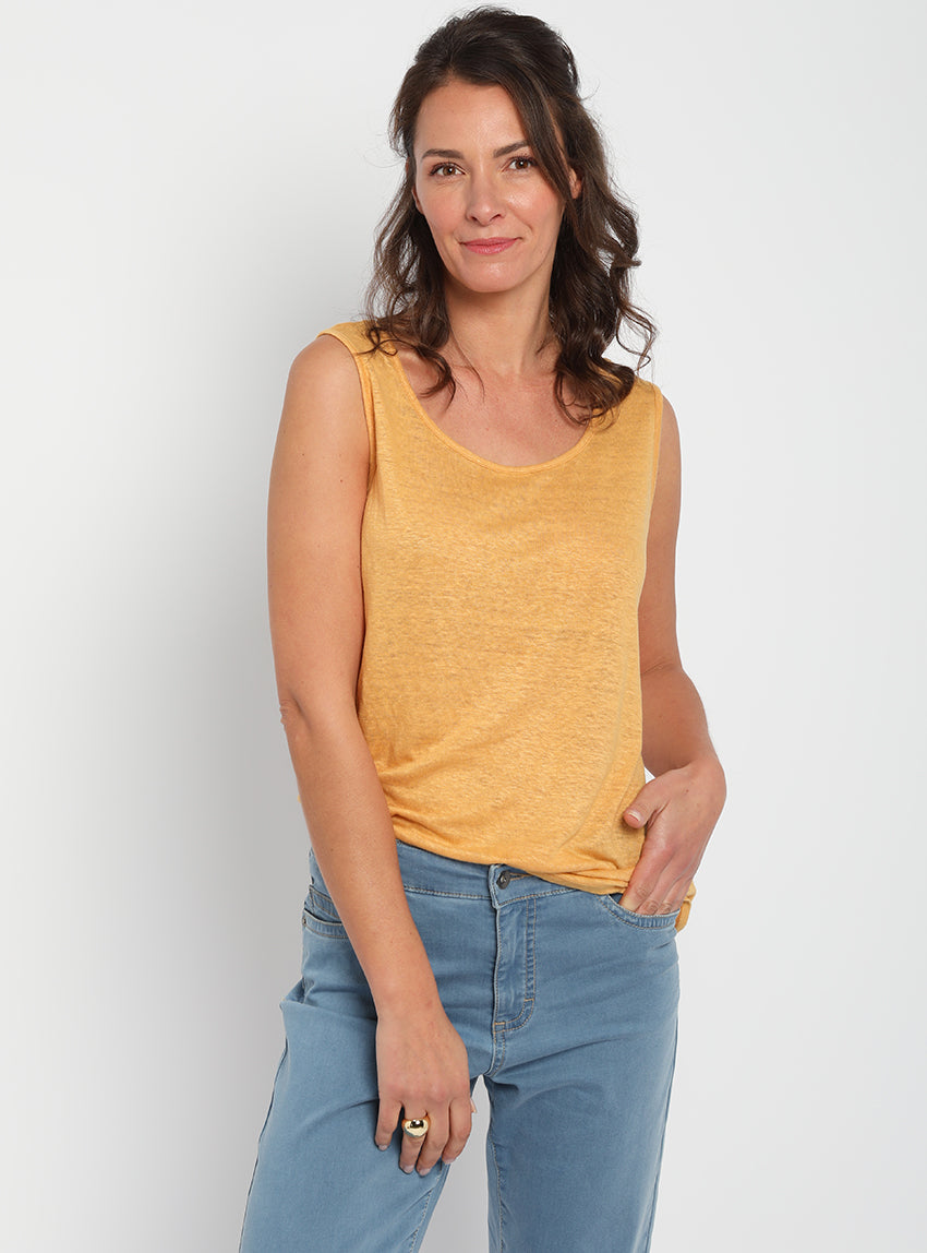 Ce débardeur femme en 100 % lin jaune d’or est la pièce parfaite pour illuminer vos journées estivales. Sa coupe droite et son encolure arrondie me...
