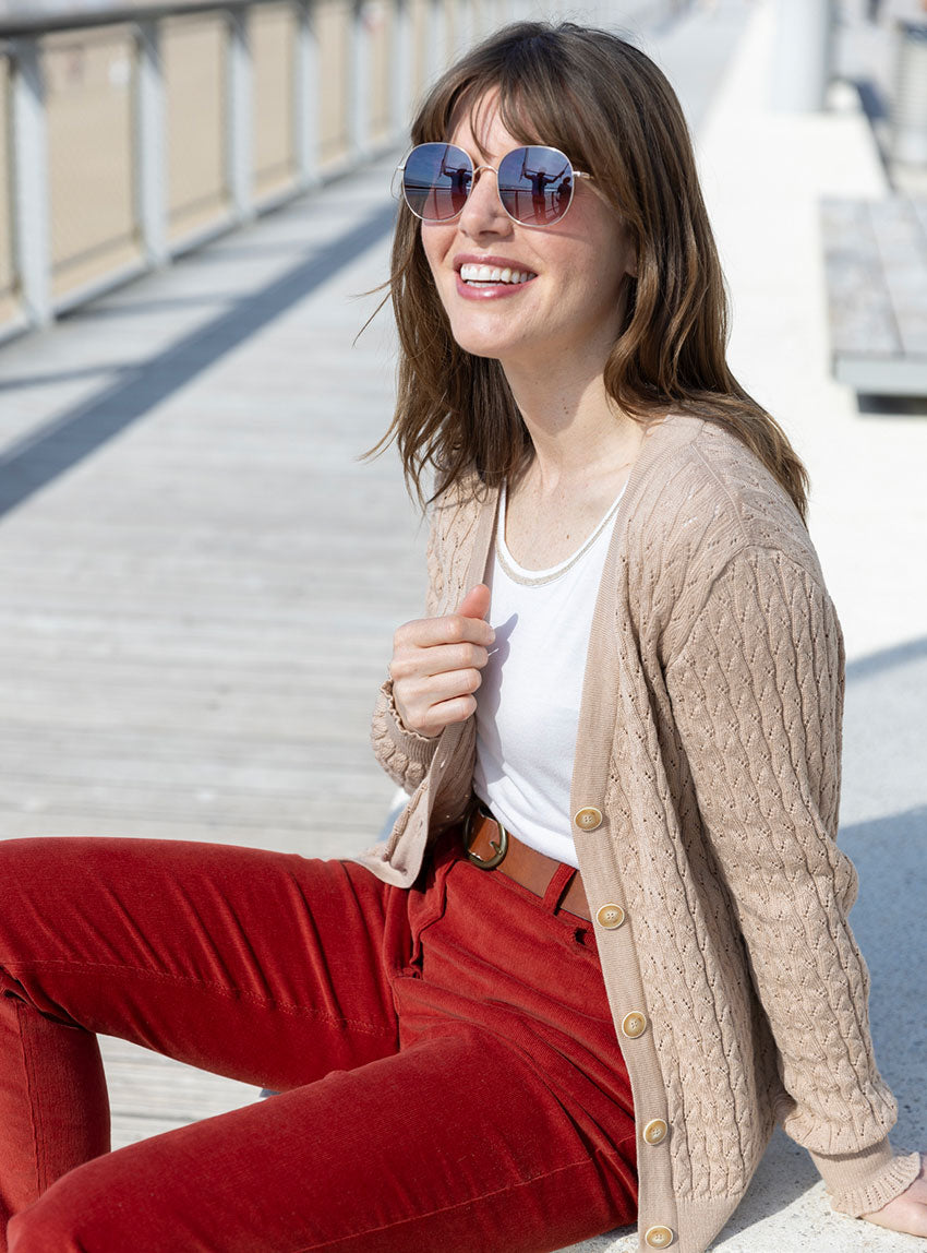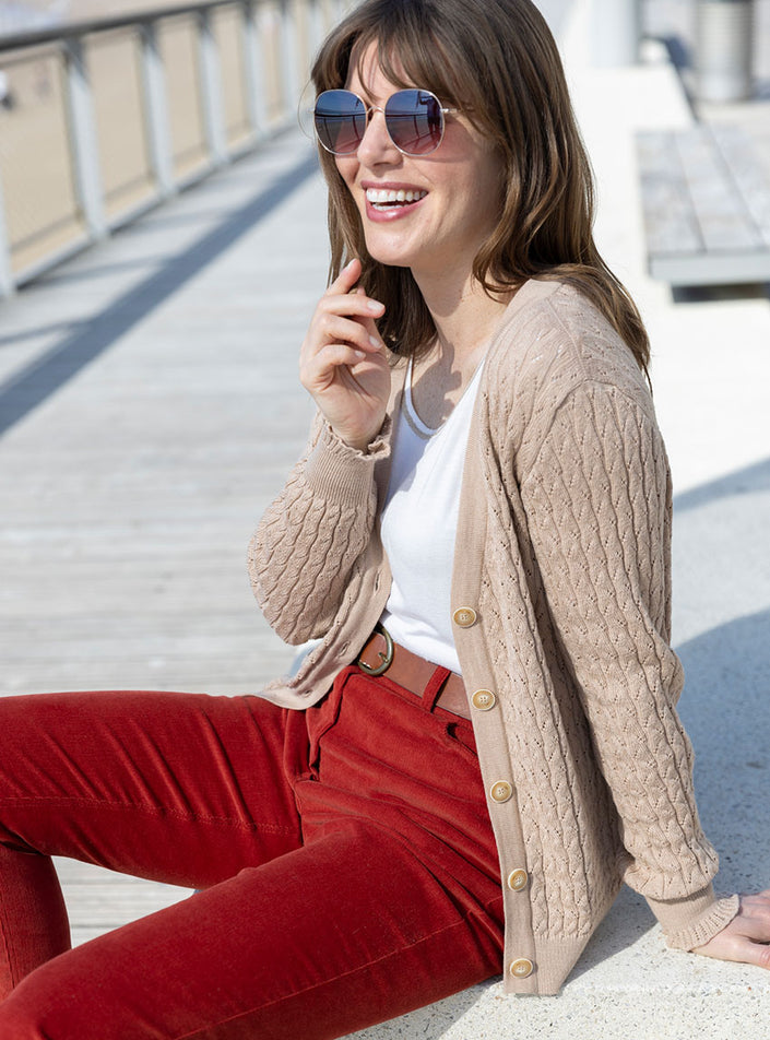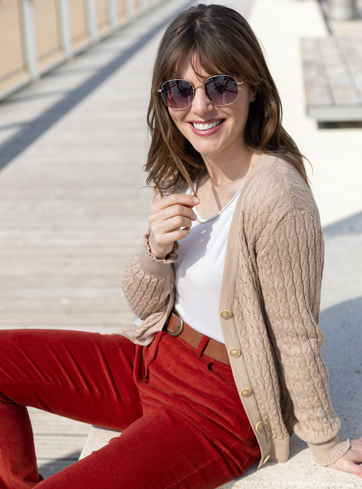 Décliné dans un coloris beige chaud, doux et lumineux, ce gilet s’accorde facilement à une multitude de looks. Il se marie parfaitement avec des teintes neutres comme l’écru ou le gris perle, mais peut également contraster avec des couleurs plus vives comme le bordeaux ou le bleu marine. Une pièce polyvalente et élégante qui apporte une note de chaleur et de féminité à votre garde-robe.