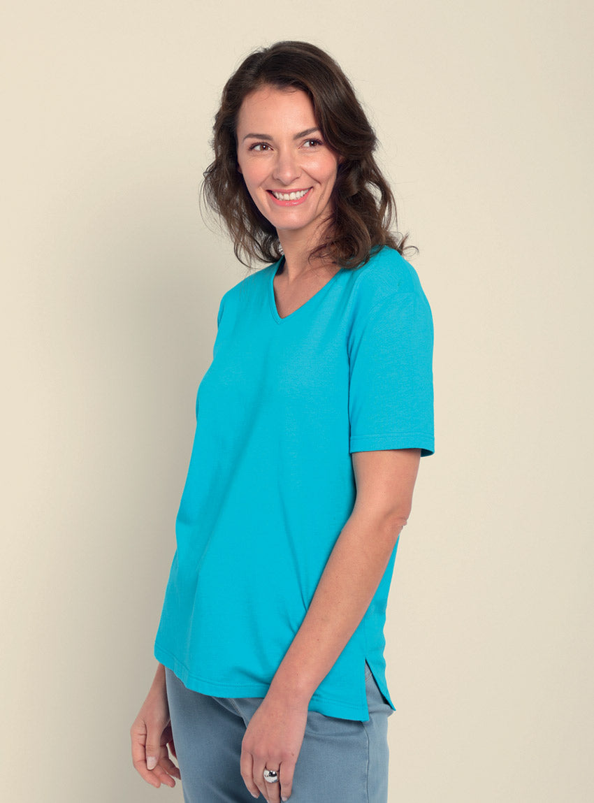 Ce haut femme en coton et lin bleu turquoise a été conçu pour conjuguer confort, féminité et légèreté naturelle. Sa maille jersey fine composée de 70% coton, 25% lin et 5% élasthanne offre une texture douce et souple qui laisse respirer la peau tout en assurant une belle tenue. Son décolleté en V valorise le port de tête et apporte une touche de féminité, tandis que sa coupe fluide épouse les formes avec élégance. Sa teinte bleu turquoise, éclatante et apaisante, évoque la mer et le ciel d’été, apportant fraîcheur et vitalité à toutes vos tenues. Facile à porter, il se marie aussi bien avec un jean clair qu’un pantalon blanc ou une jupe en lin. Fabriqué en Nouvelle-Aquitaine, il met à l’honneur le savoir-faire français et les matières naturelles de qualité.