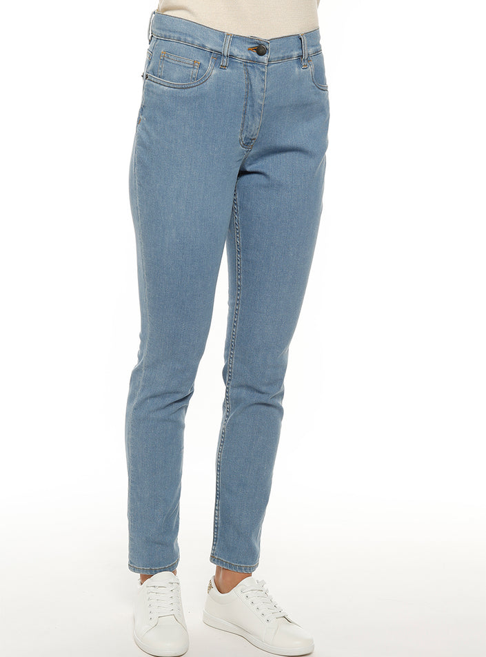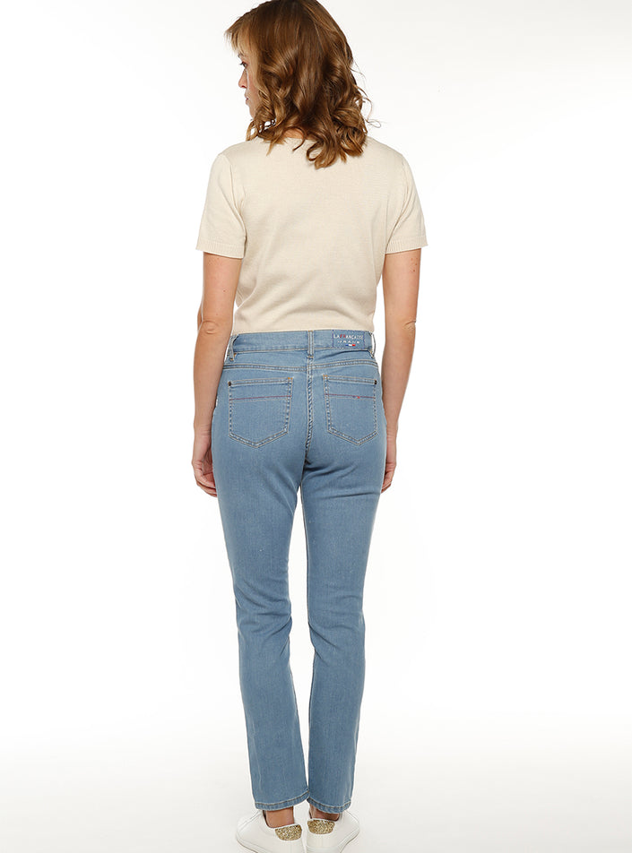 Découvrez le jean femme coupe droite bleu clair, un modèle Made in France qui allie élégance, confort et authenticité. Confectionné à partir de cot...