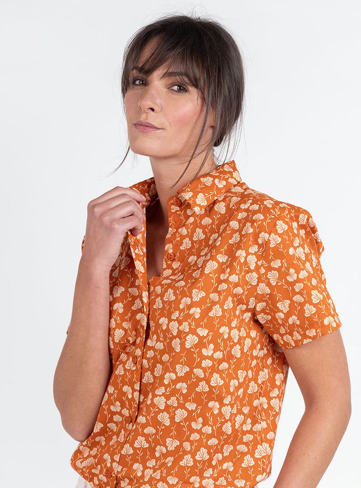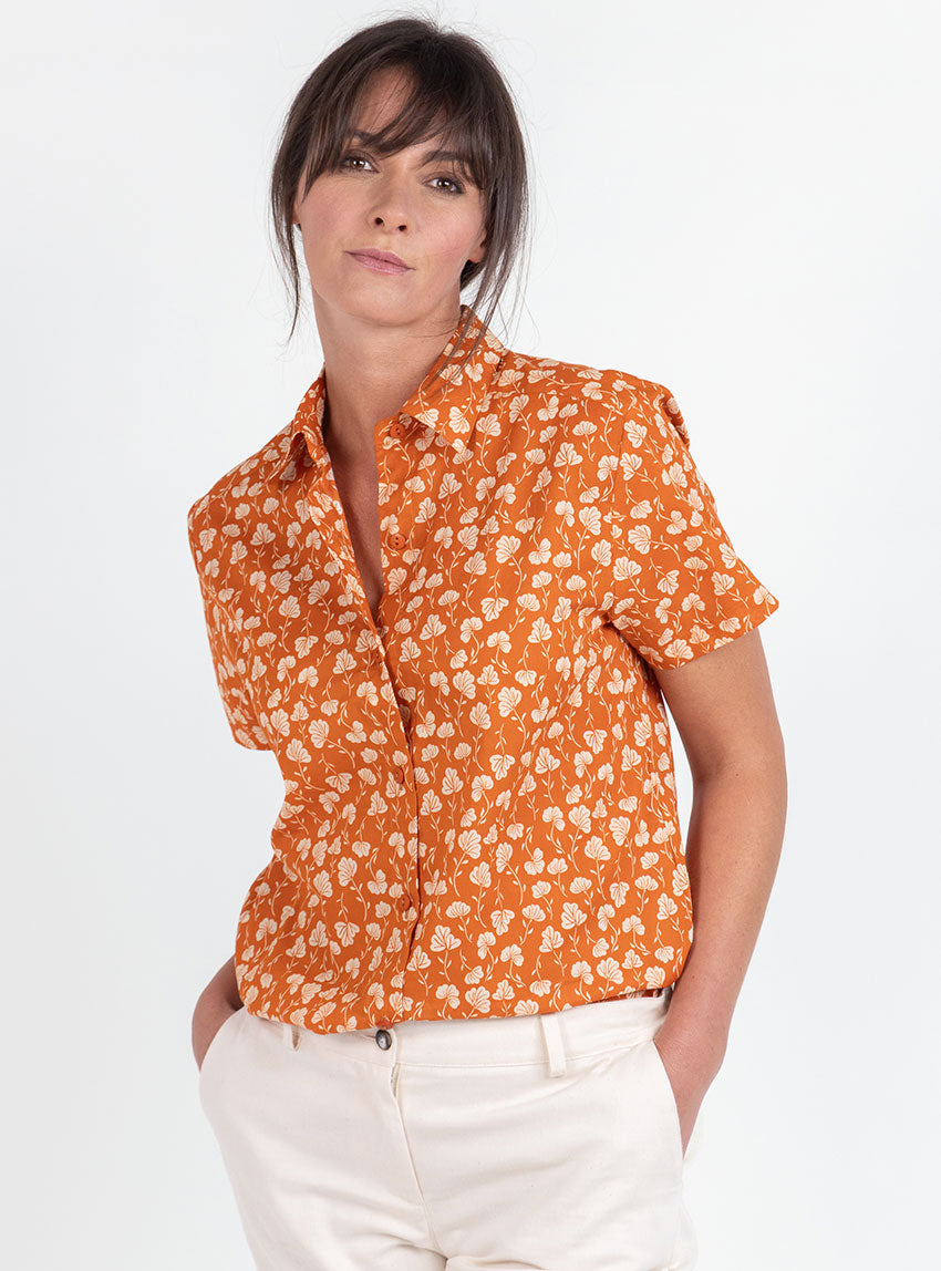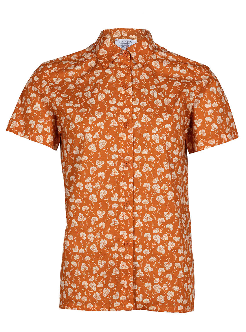 Ce chemisier femme rayé Imprimé Orange Ocre, fabriqué en France, séduit par son style solaire et élégant. Sa coupe droite avec fentes sur les côtés assure un porté fluide et confortable, tandis que ses manches courtes apportent légèreté et modernité. Le col classique sur pied de col structure la silhouette et fait de ce modèle une pièce facile à porter, aussi bien au quotidien que pour des occasions plus soignées. Sa longueur d’environ 65 cm convient à toutes les morphologies.