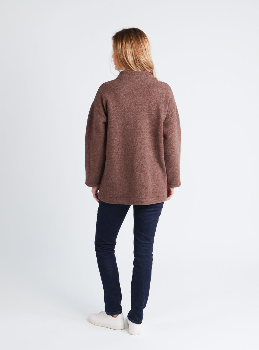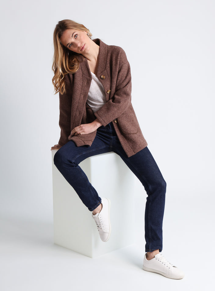 Le tissu en laine bouillie confère à ce manteau une texture souple et moelleuse, tout en garantissant une isolation thermique naturelle. Les emmanchures descendues et les poches plaquées apportent une touche de décontraction élégante. Sa teinte marron glacé, douce et raffinée, s’accorde aisément avec des tons naturels, du beige au noir, pour une allure harmonieuse et sophistiquée.