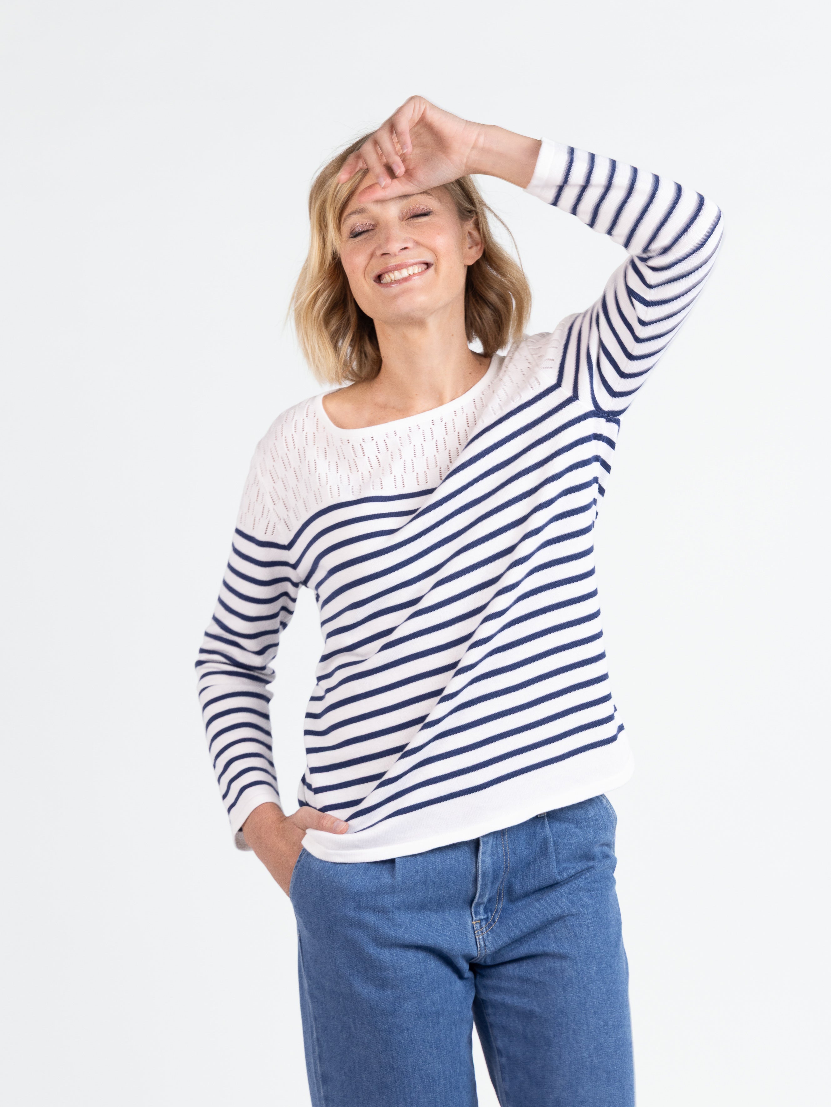 Cette marinière femme blanche – Édition Limitée Été 2026 revisite un grand classique avec modernité et élégance. Dotée d’une encolure carrée féminine et de manches longues, elle se distingue par son jeu de rayures sur le corps et les manches. La maille ajourée sur le haut apporte légèreté et raffinement, pour une silhouette subtilement travaillée. Sa longueur d’environ 62 cm permet un porté harmonieux, aussi bien avec un pantalon qu’une jupe. Disponible du 38 au 50 – Prix : 139€