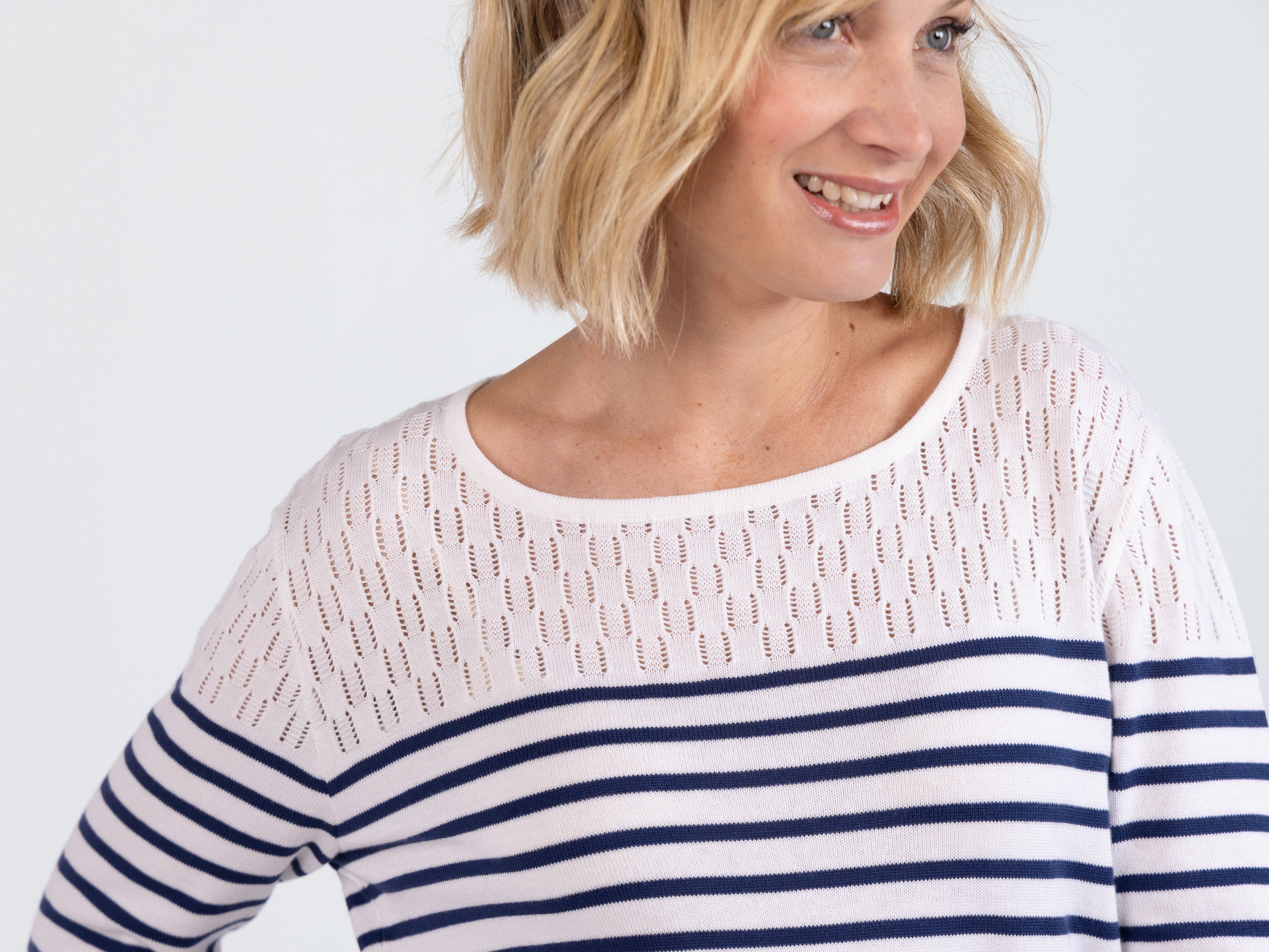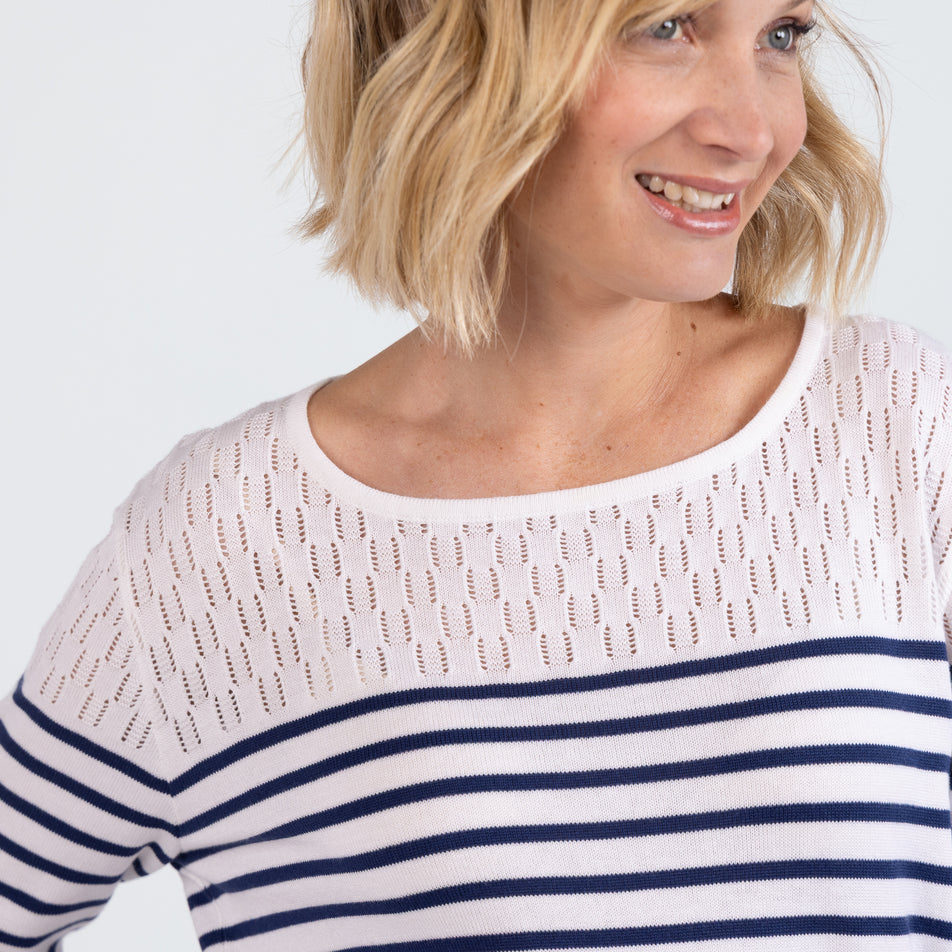 - Jeu de rayures et maille ajourée sur le haut