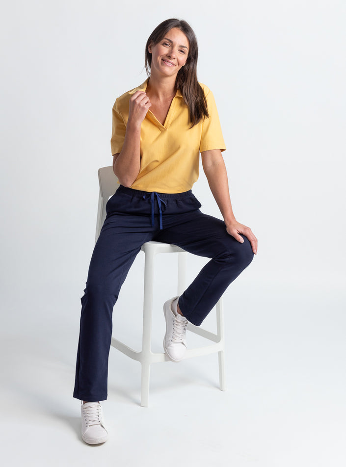 Confectionné à partir de 92 % coton et 8 % élasthanne, ce pantalon offre un équilibre parfait entre souplesse, douceur et maintien. Sa ceinture élastiquée est agrémentée d’un cordon fantaisie pour un ajustement optimal. Les poches italiennes soulignées d’un biais brillant ajoutent une note raffinée et moderne, idéale pour un look à la fois confortable et élégant.