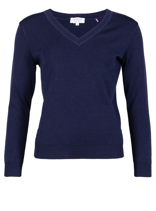 Pull femme col V en laine bleu marine
