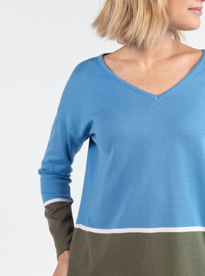 Pull femme col V coton bleu pacifique