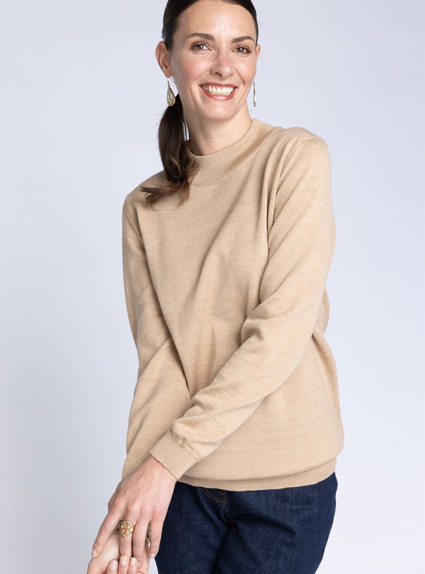 PULL FEMME COL CHEMINÉE EN LAINE MÉRINOS BEIGE CHAUD