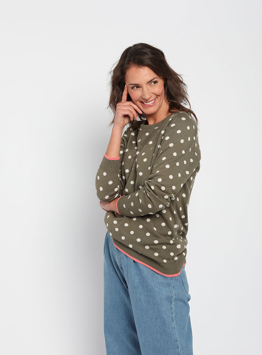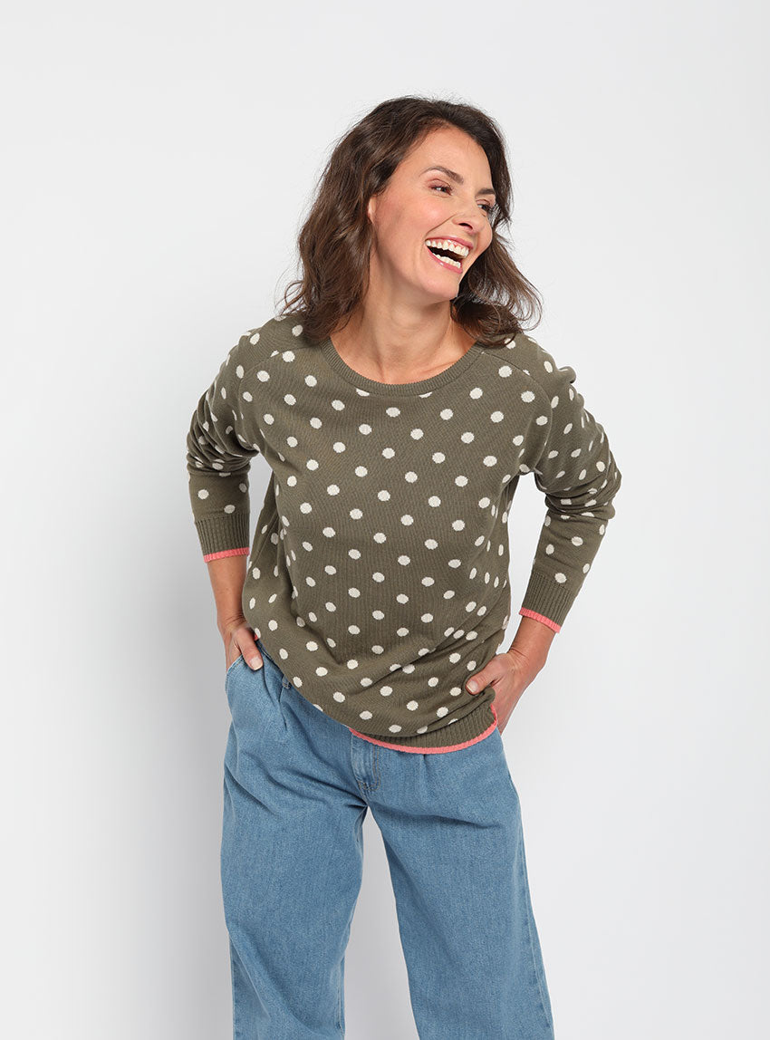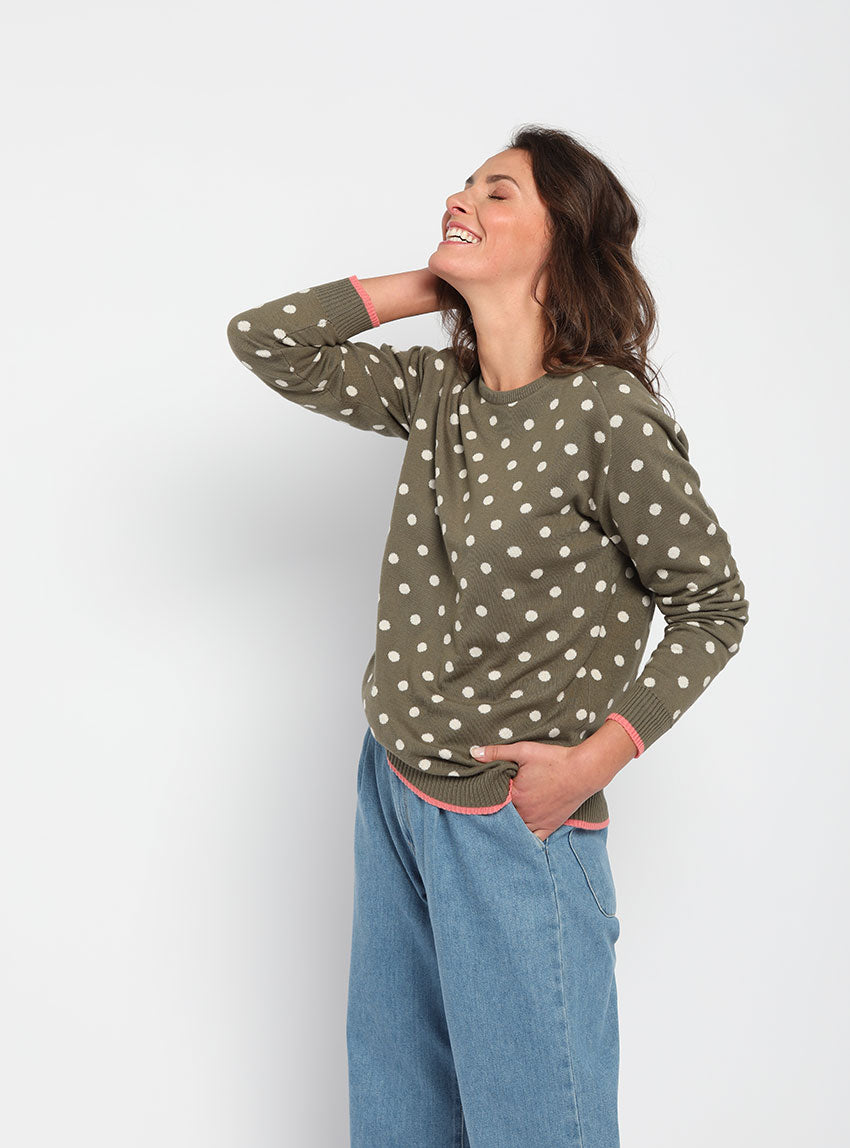 Ce pull à pois en coton et acrylique combine confort et originalité. Avec sa coupe ajustée, il épouse joliment la silhouette, tout en offrant la po...