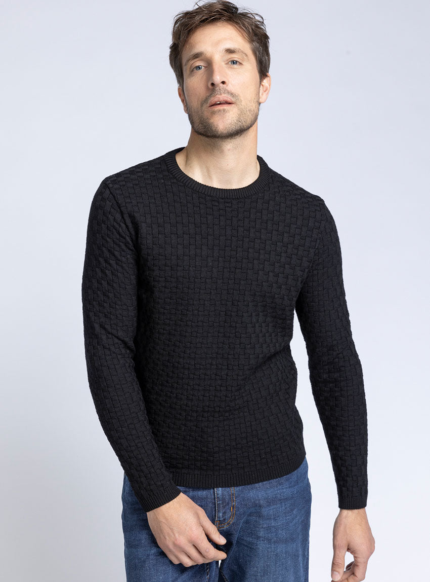 Disponible en noir profond, ce pull séduit par son élégance intemporelle et sa polyvalence. Cette teinte sobre s’associe aisément avec toutes les tenues, qu’elles soient formelles ou décontractées. Porté seul, il met en valeur la texture de sa maille, et sous une veste, il apporte une note moderne et chic.