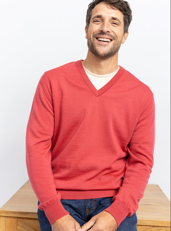 PULL HOMME COL V 100% LAINE MÉRINOS ROUGE TENDRE