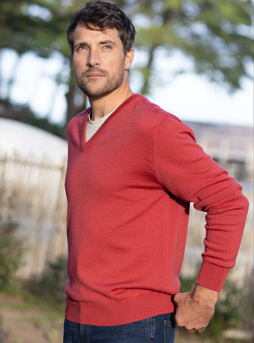 Pull homme col V 100% laine mérinos rouge terre de sienne