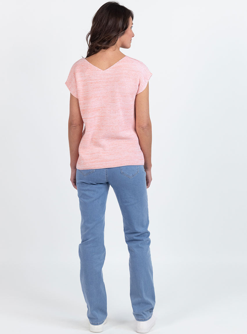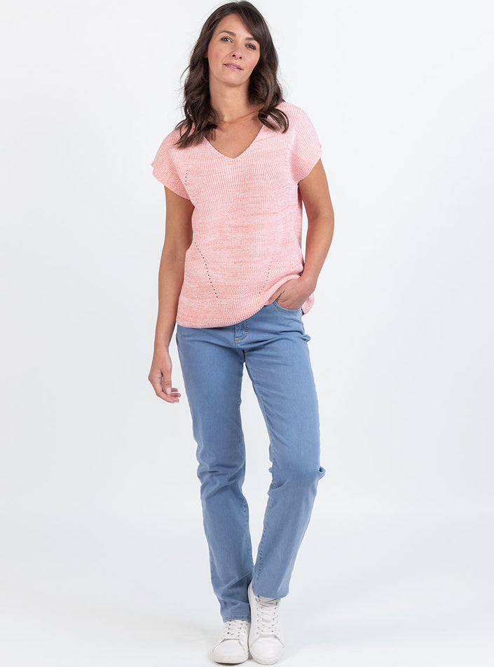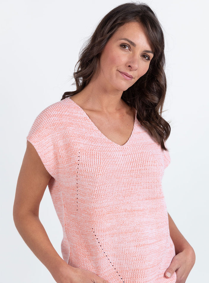 Ce pull femme sans manches Orange Melon, fabriqué en France, est une pièce moderne et raffinée, idéale pour les superpositions élégantes. Son décolleté en V à l’avant et au dos apporte une touche féminine et contemporaine, tandis que sa maille perlée avec ajourés placés sur le devant structure délicatement la silhouette. Facile à porter sur une chemise, un tee-shirt ou à même la peau, il s’adapte à toutes les saisons. Sa longueur équilibrée assure un tombé harmonieux.
