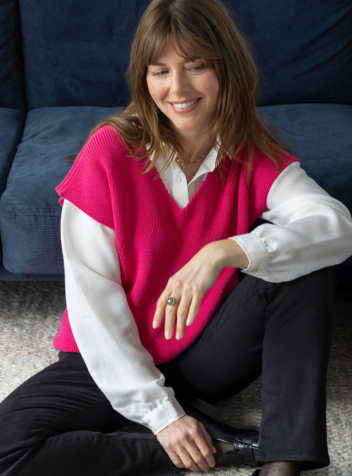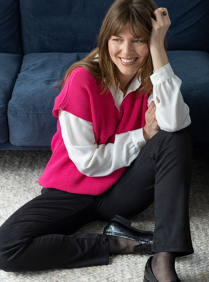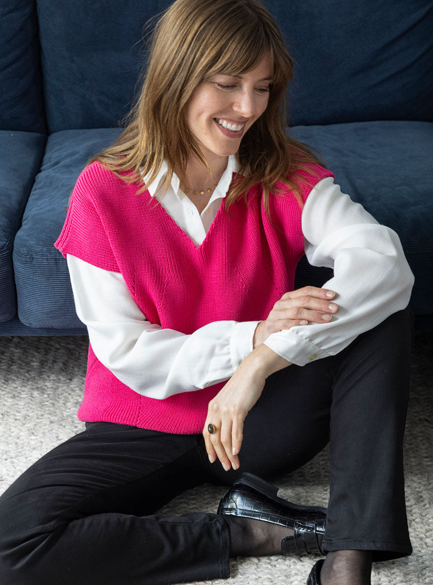 Ce pull sans manches femme en 100% laine mérinos est l’allié parfait pour conjuguer style et confort au quotidien. Fabriqué en France avec soin, il se distingue par sa coupe élégante, son encolure en V et sa maille perlée travaillée avec des détails ajourés subtils sur le devant. Léger mais chaud, il est idéal pour superposer vos tenues tout en restant chic.