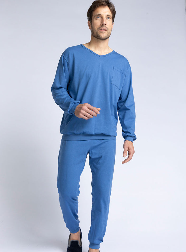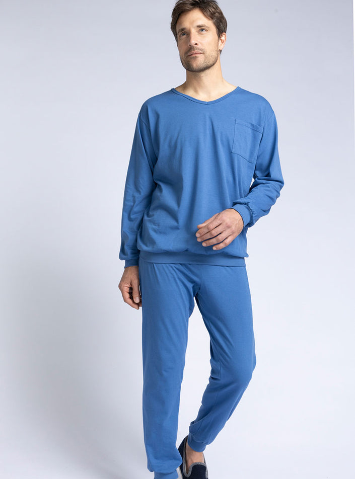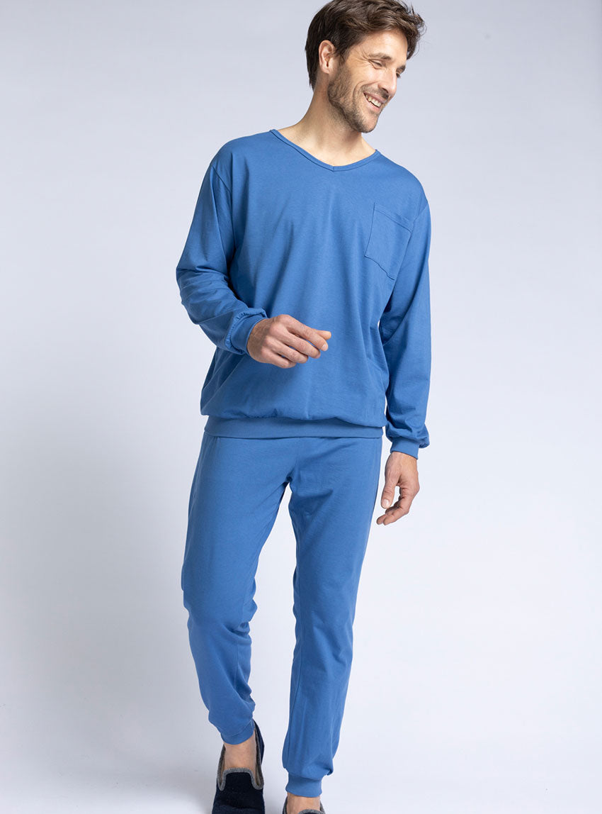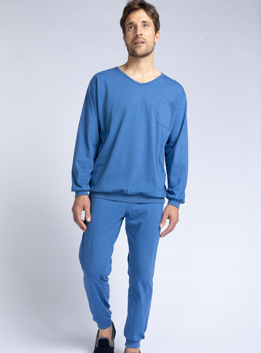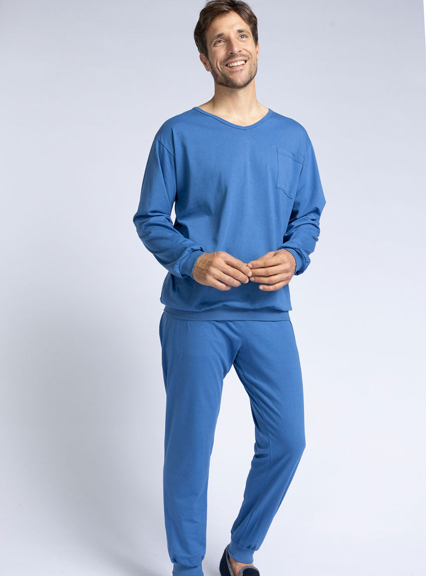 Ce pyjama homme en coton bleu foncé offre un parfait équilibre entre confort, chaleur et élégance. Sa coupe droite, son encolure V raffinée et son ...