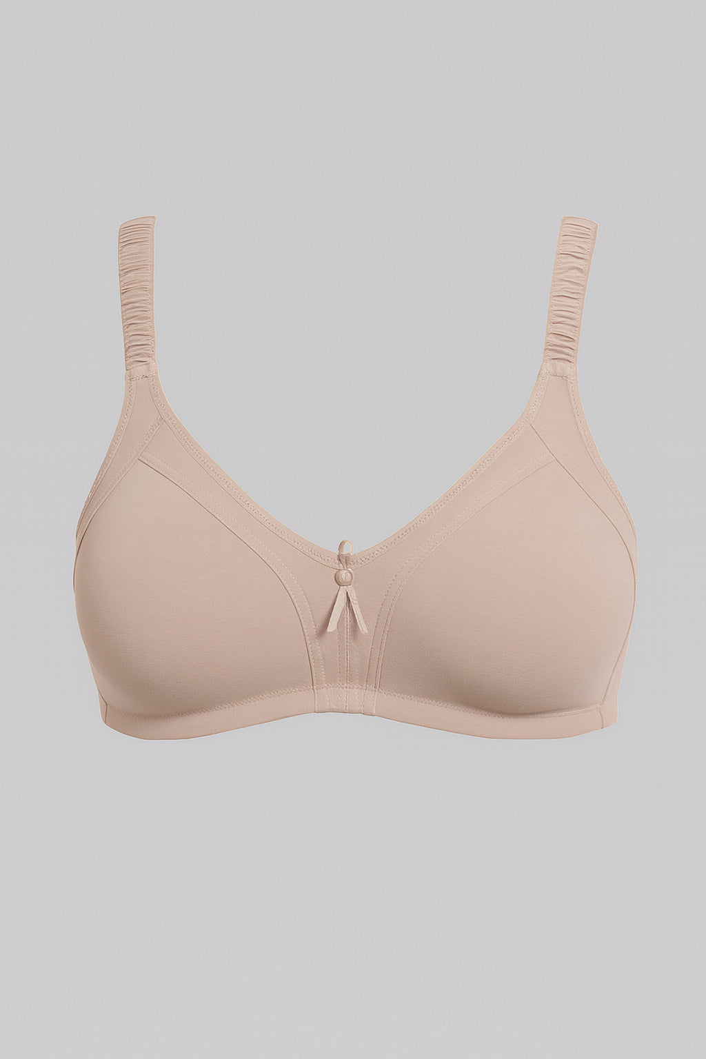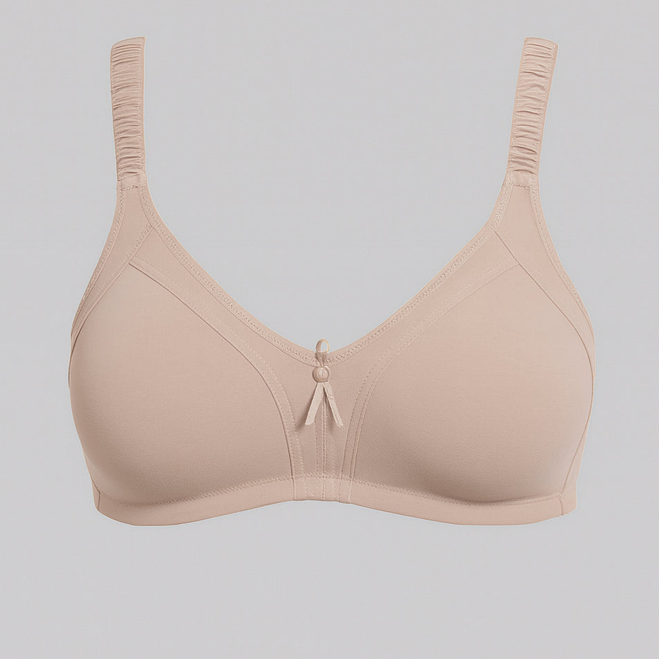 Les bonnets moulés à coutures plates assurent une forme naturelle et un confort sans frottement, parfait pour les peaux et poitrines sensibles. Les bretelles larges ornées d’un tissu satin plissé apportent une touche raffinée tout en soulageant les épaules. L’agrafe au dos à 4 positions permet un ajustement précis et personnalisé. Un petit nœud délicat sur le devant souligne la féminité de ce modèle, conçu pour associer douceur, maintien et élégance discrète.
