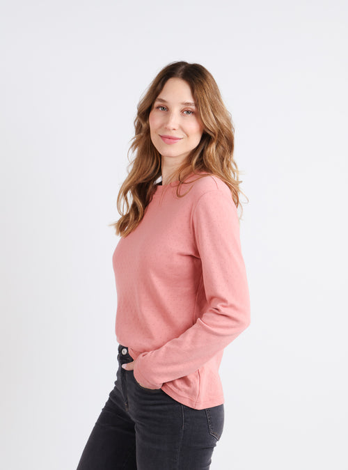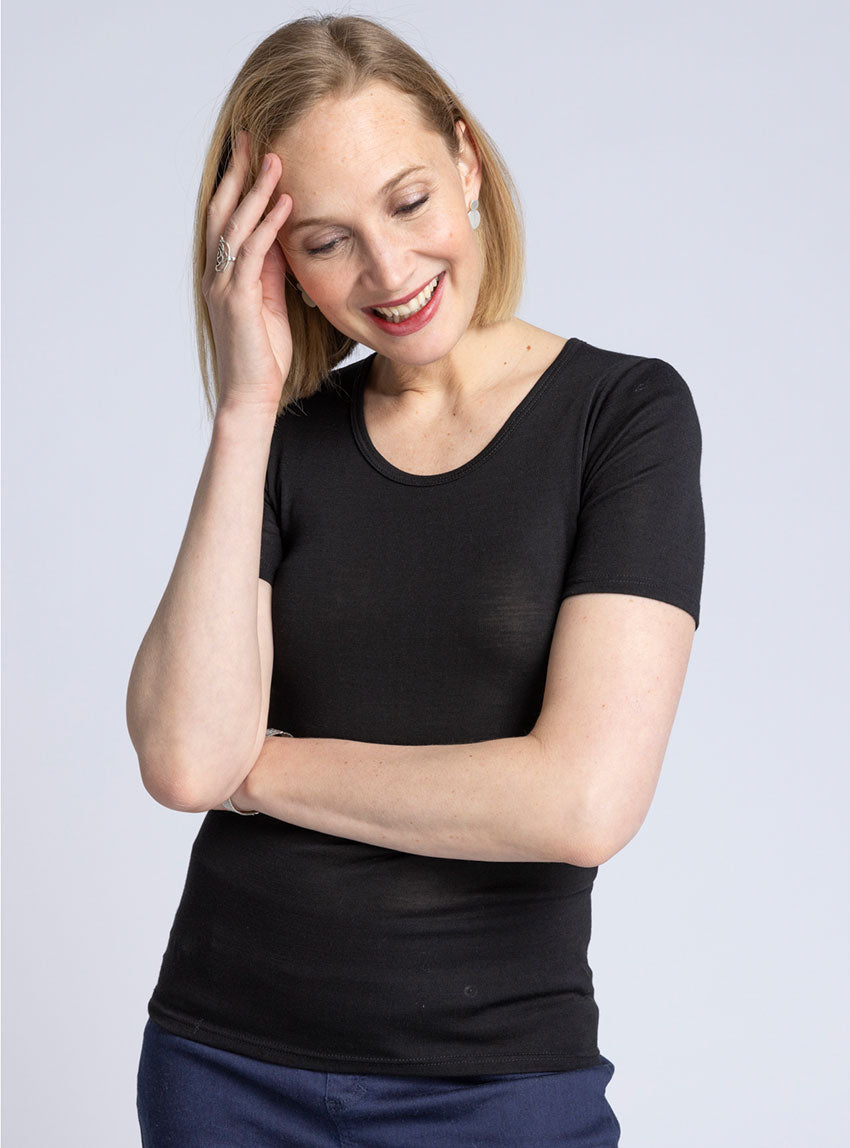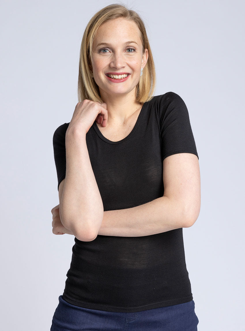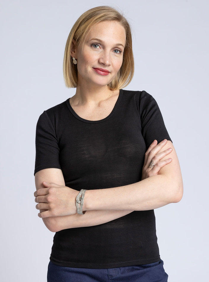 Alliez confort et élégance avec ce t-shirt femme en laine mérinos extrafine et soie, fabriqué en France. Sa coupe près du corps et ses manches cour...