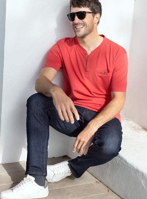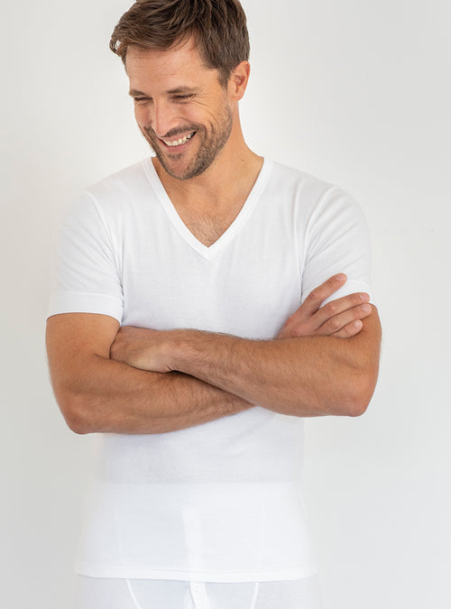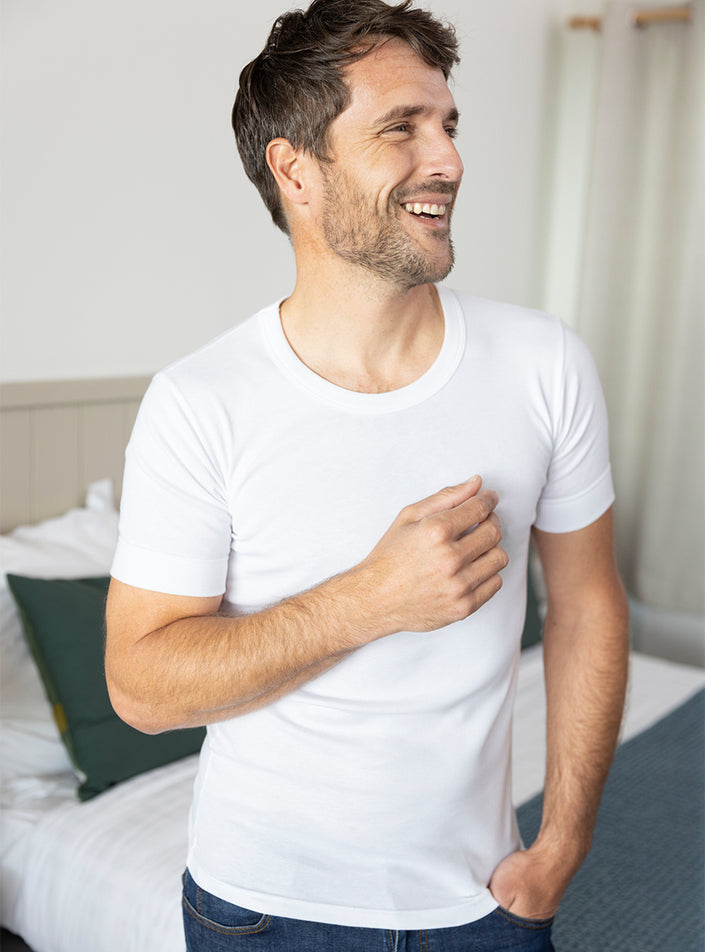 Ce tee-shirt homme en coton peigné blanc est un essentiel du vestiaire masculin, alliant confort, solidité et élégance sobre. Confectionné en France dans une maille fine et serrée 100% coton peigné longues fibres, il offre une grande douceur au toucher et une excellente tenue au fil des lavages. Sa coupe classique à col ras du cou et manches courtes permet de le porter seul pour un look épuré ou en sous-vêtement chaud et respirant sous une chemise ou un pull. La qualité du tricot serré garantit une résistance optimale aux déformations et un maintien parfait. Un basique intemporel, fabriqué avec soin, qui incarne le savoir-faire français et le confort naturel du coton haut de gamme.
