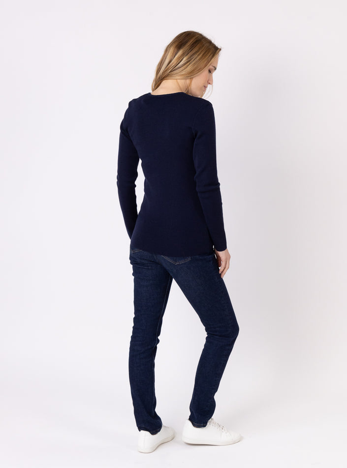 Ce tee-shirt femme en laine mérinos bleu marine a été conçu pour offrir une chaleur modérée tout en restant léger et respirant, avec une coupe ajustée qui suit le mouvement du corps grâce à un tricot en côte 1x1 naturellement extensible. Sa laine fine certifiée et labellisée France Terre Textile garantit une matière saine et agréable au contact de la peau, procurant une sensation de douceur idéale pour un porté toute la journée. Sa couleur bleu marine apporte une touche d’élégance intemporelle que l’on peut porter seule avec un jean pour un style simple et raffiné ou glisser sous une veste ou un gilet en maille pour une superposition discrète et féminine.