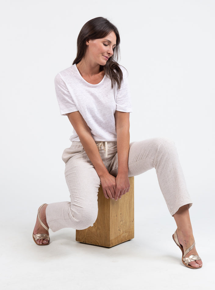 Ce tee-shirt femme en lin blanc a été conçu pour offrir un confort inégalé et une fraîcheur naturelle tout au long de l’été. Réalisé dans une maille jersey 100% lin, il séduit par sa texture douce et légèrement fluide, agréable au contact de la peau. Le lin, fibre naturelle thermorégulatrice et absorbante, permet de rester au frais même lors des journées les plus chaudes. Sa coupe simple et féminine, ses manches courtes et son col rond en font un basique indispensable du vestiaire estival. Facile à accorder avec un jean, un pantalon en toile ou une jupe, il se porte seul pour un style épuré ou sous une veste légère pour un look plus structuré. Fabriqué en France à partir d’un tissu d’origine portugaise, il allie savoir-faire local et matière naturelle de qualité.