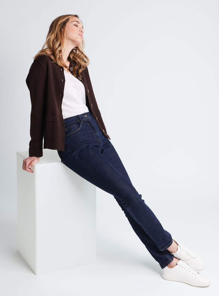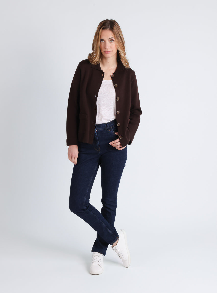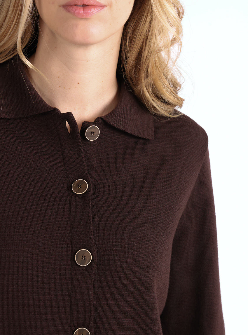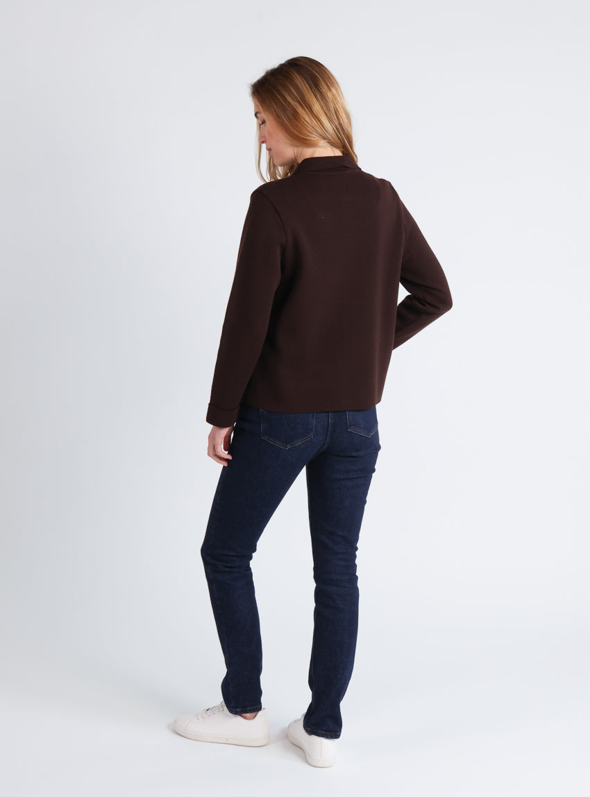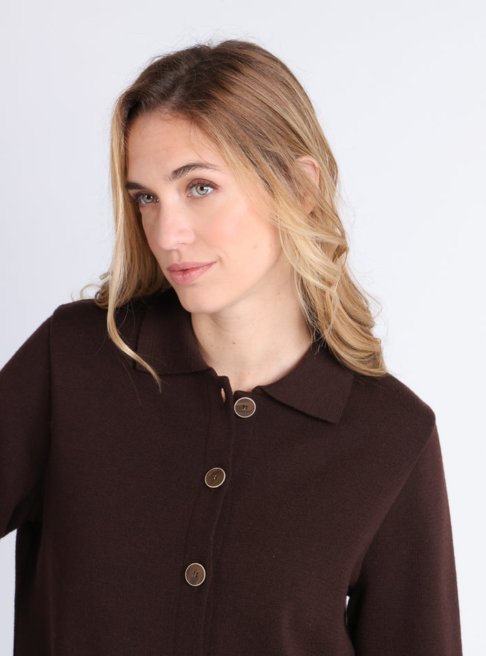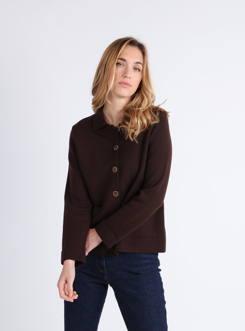 Cette veste en laine mérinos est une pièce essentielle pour une allure féminine et soignée. Sa coupe droite et son col polo apportent structure et ...