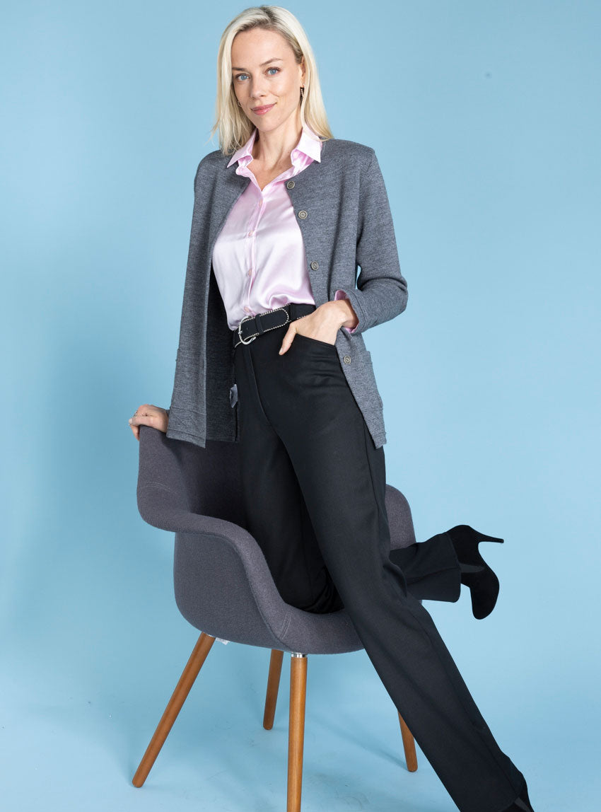 Cette veste longue en laine gris anthracite met en valeur la technicité d’un tricot un fil parfaitement équilibré entre chaleur et légèreté. Sa com...