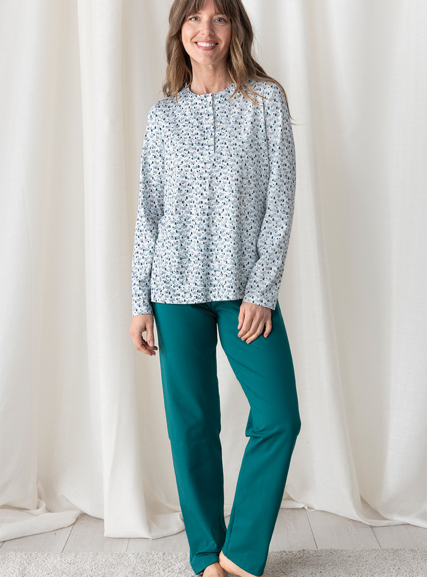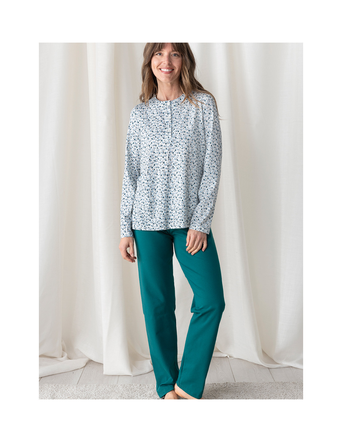 Ce pyjama vous offre une sensation de douceur et de légèreté sur votre peau. Il est composé d'un haut à manches longues et d'un pantalon assorti offrant une couverture complète pour votre corps. Le coton est un choix idéal pour les vêtements de nuit, il permet à votre peau de respirer pendant que vous dormez.